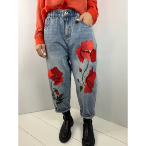 Jeans in denim con ricamo papavero. 100%CO