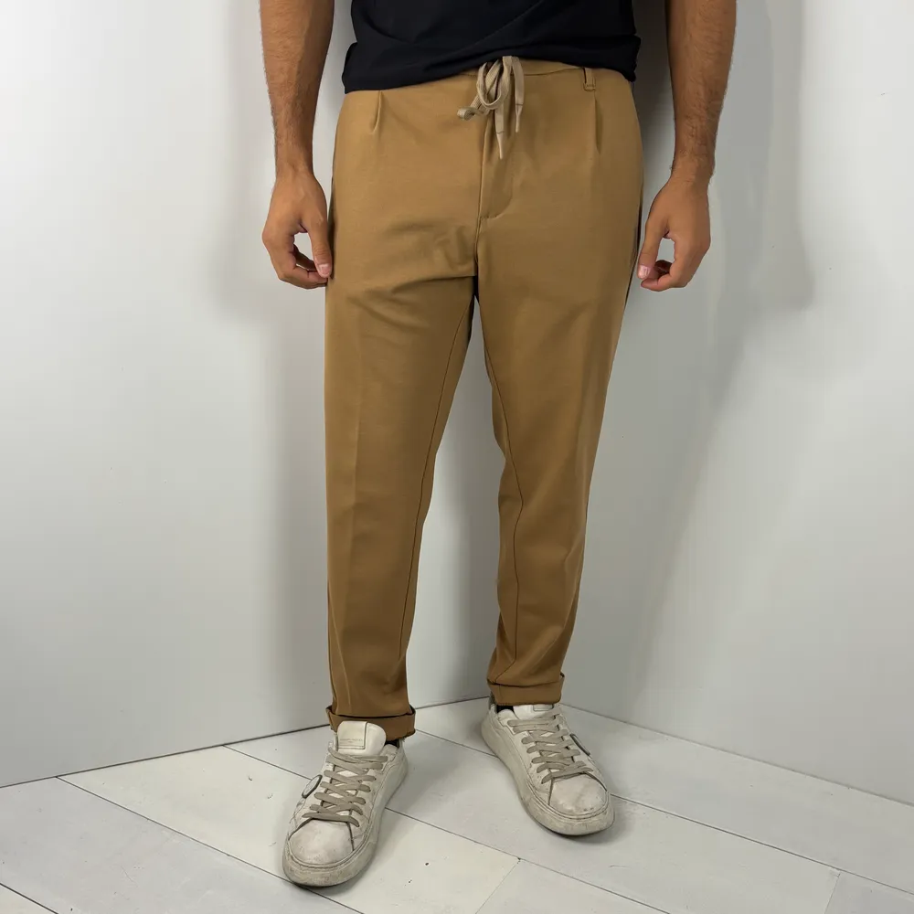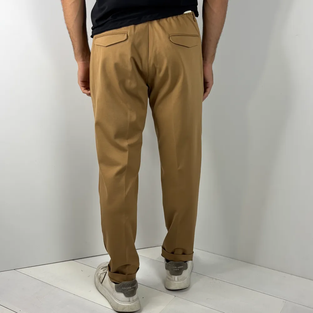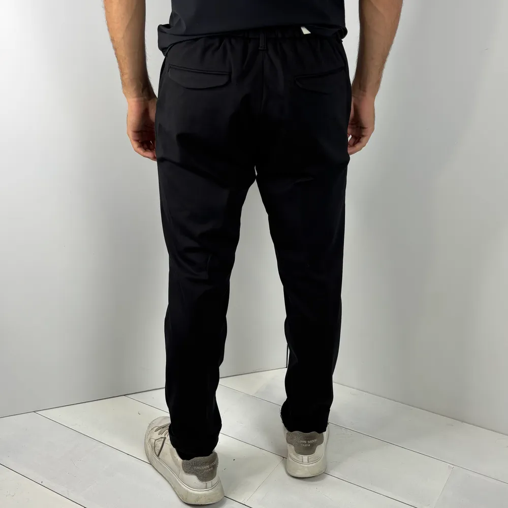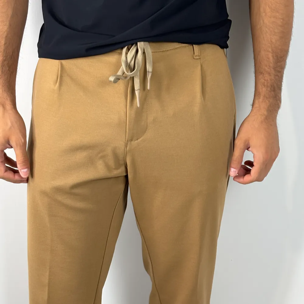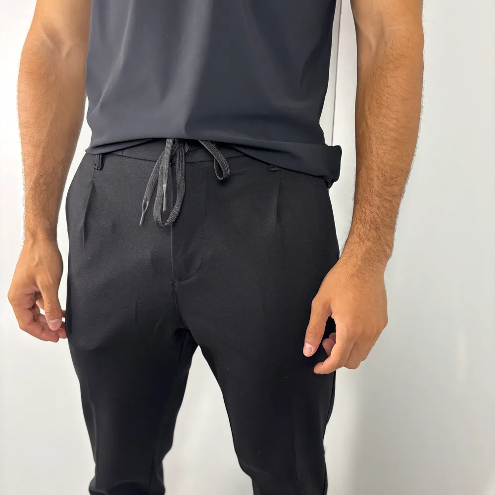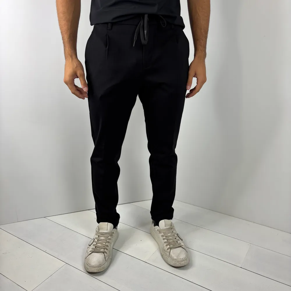 Panta laccio, con elastico in vita , bottone e cerniera e laccio.