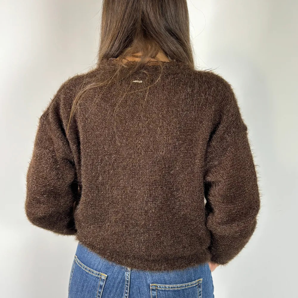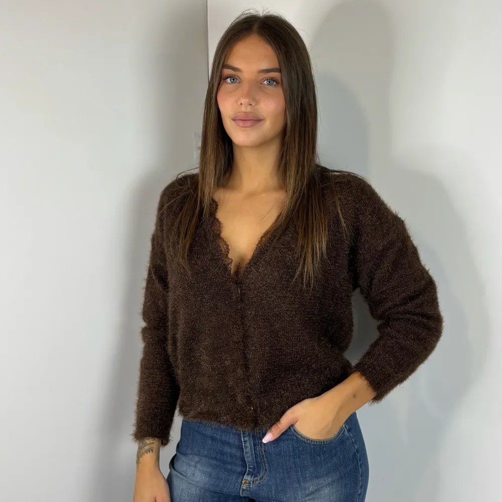 Cardigan corto con scollo a V e pizzo sui bordi del collo