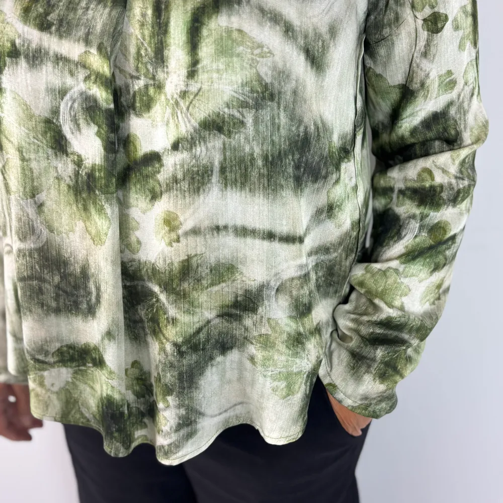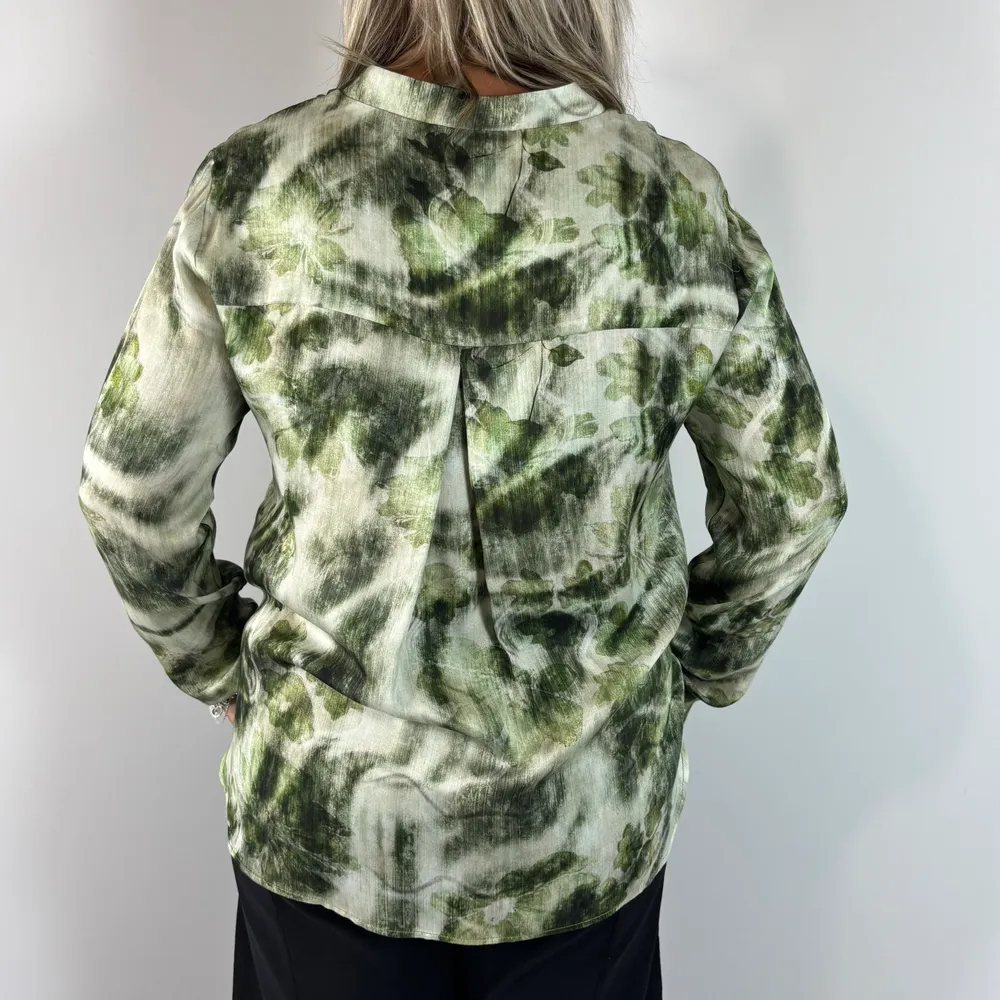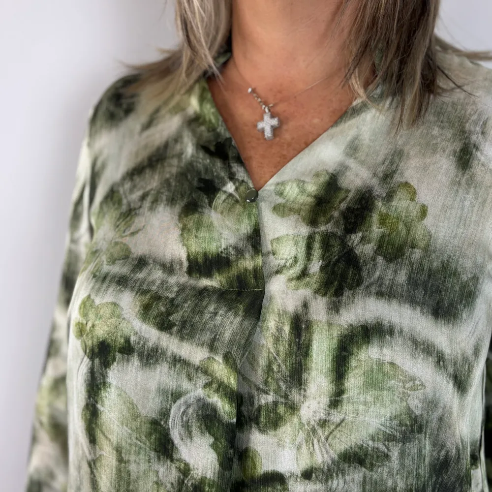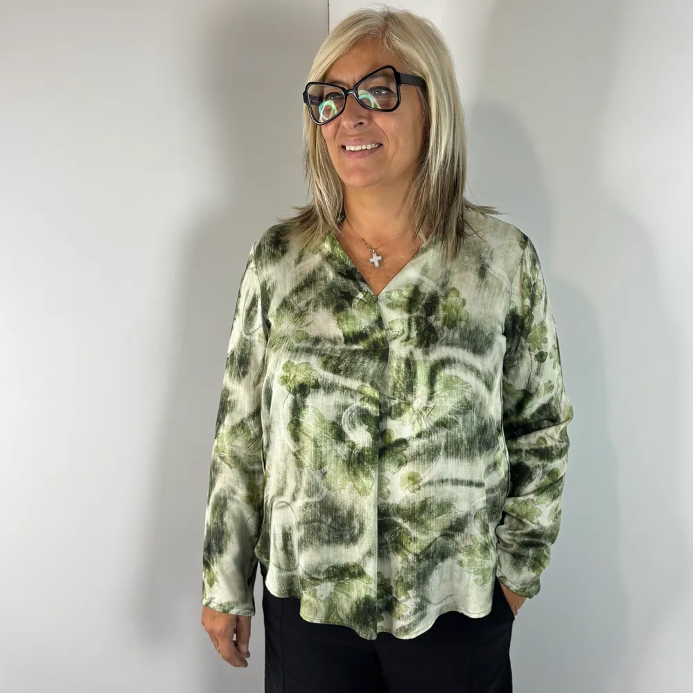 Blusa in fantasia , collo a fascetta, scollo a V.