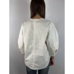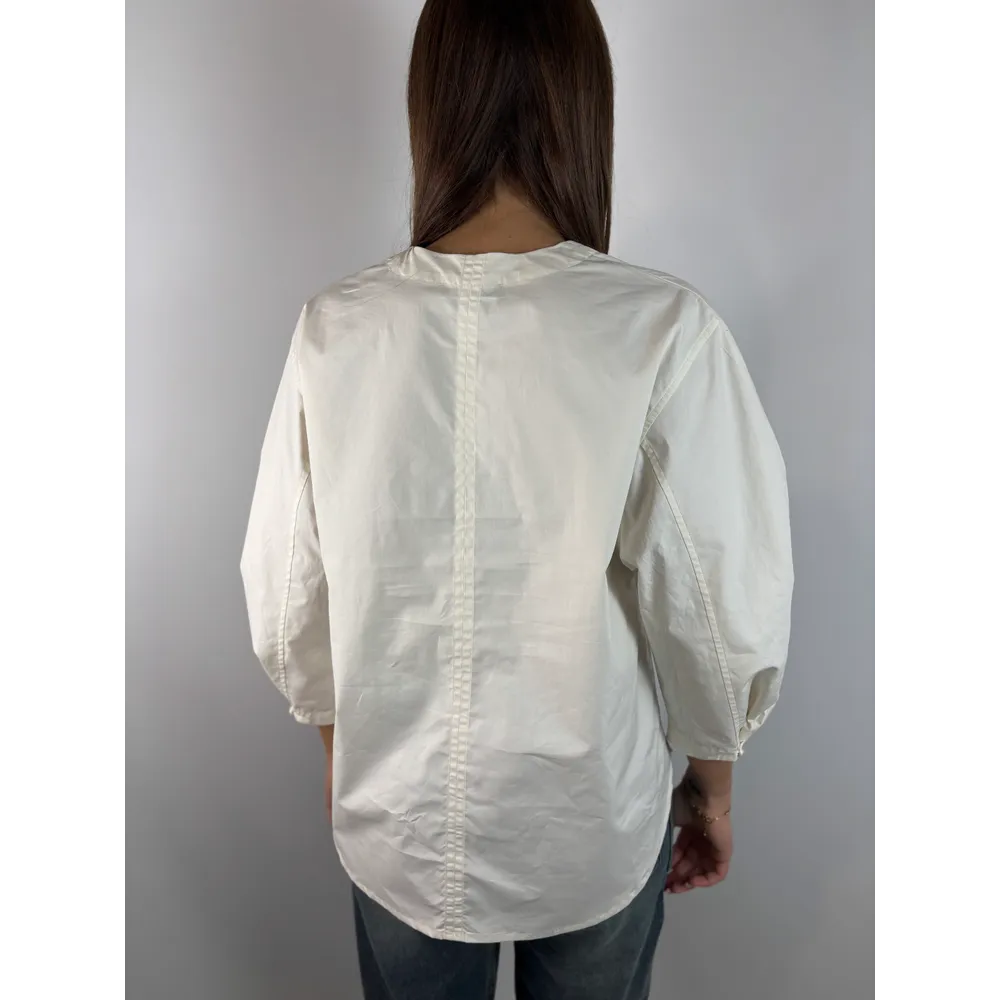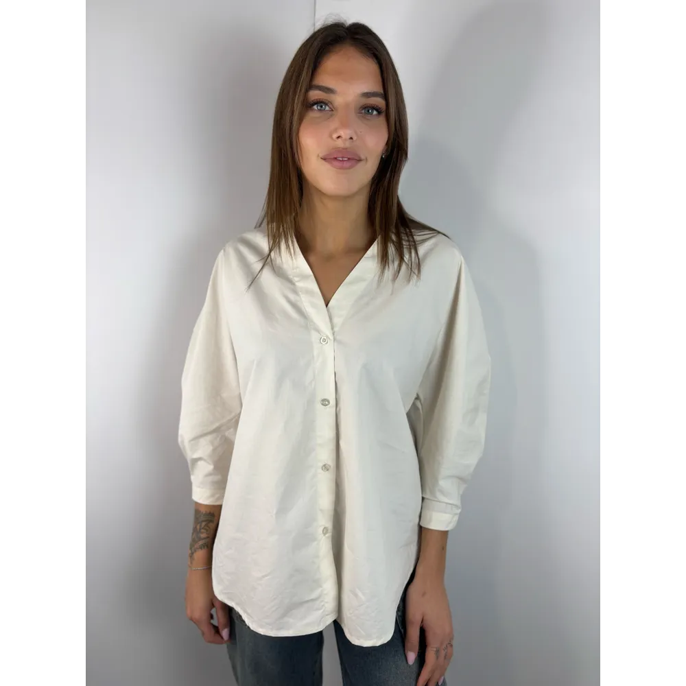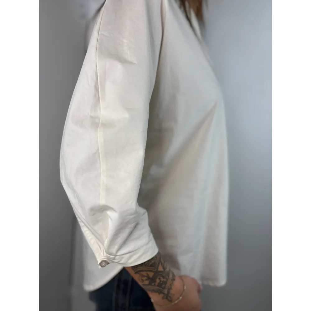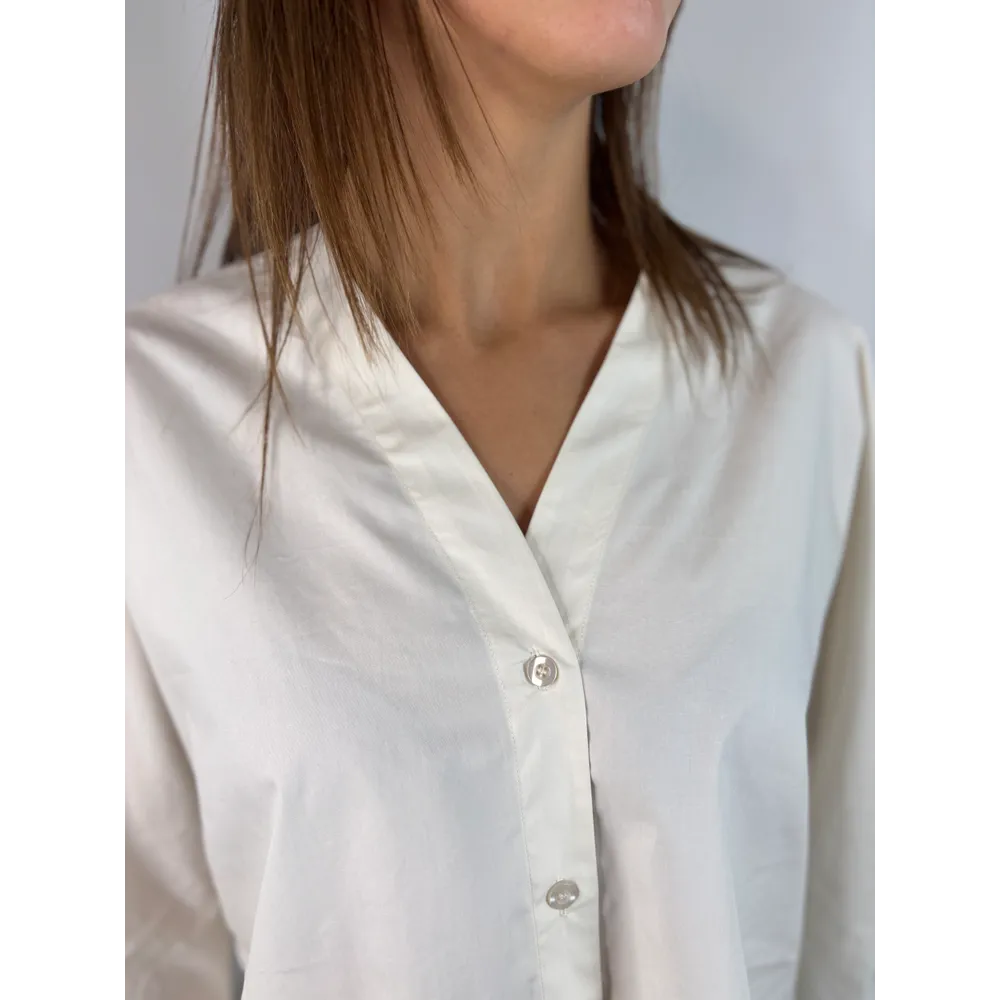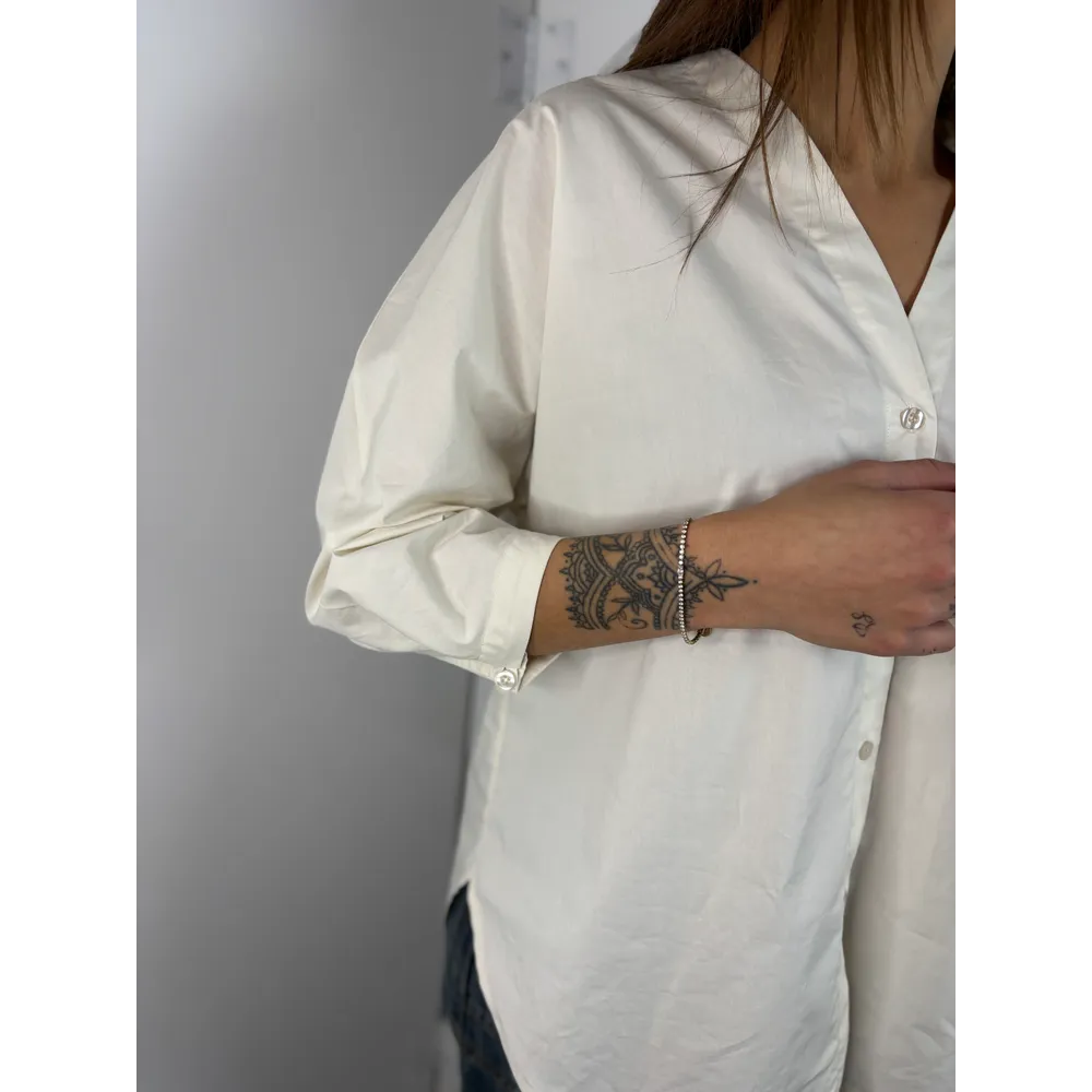 Camicia scollo a V. Bottoncino su polso per stringerlo.