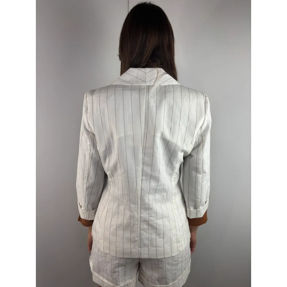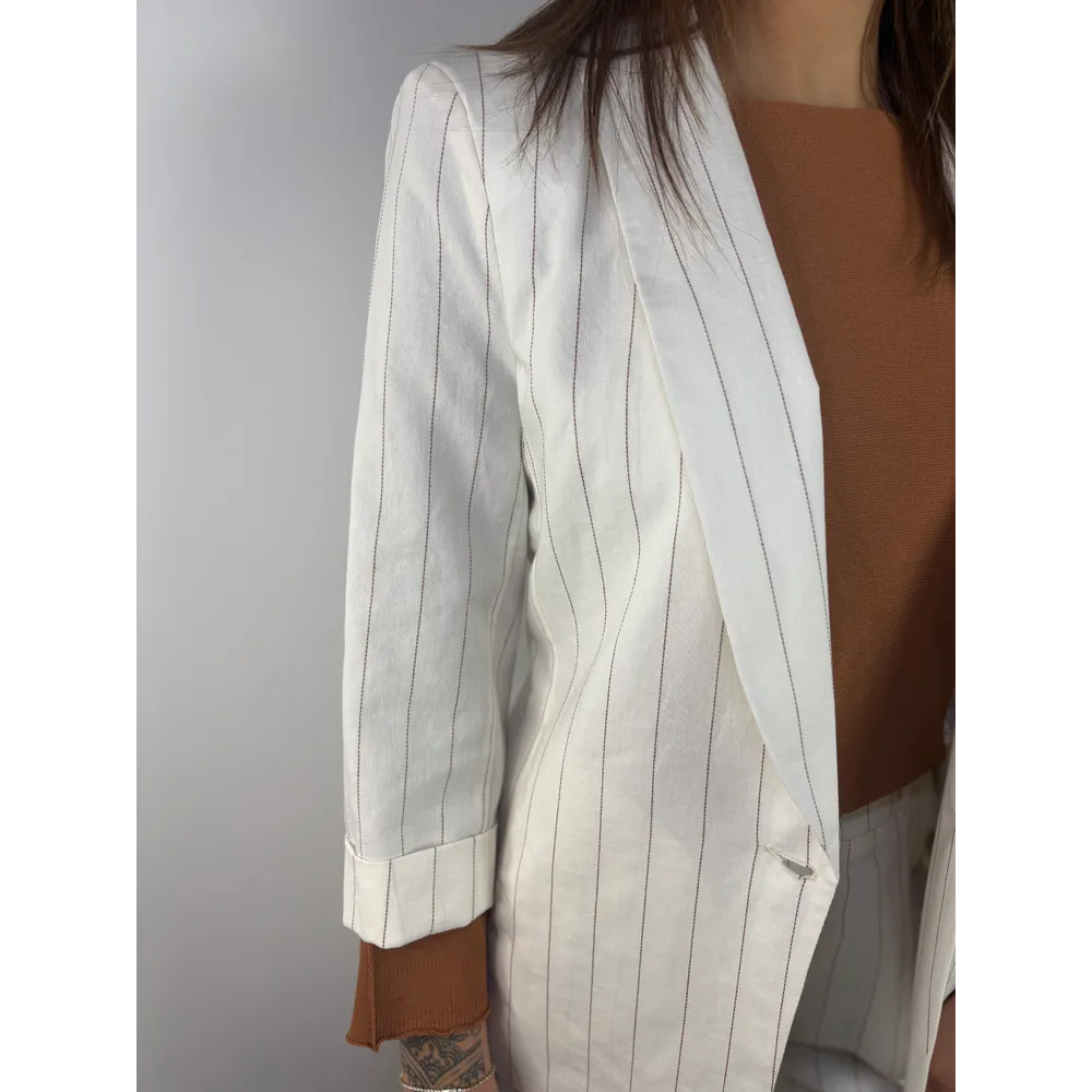 Giacca gessata conchiglia/terra, manica 3/4, collo a scialle.