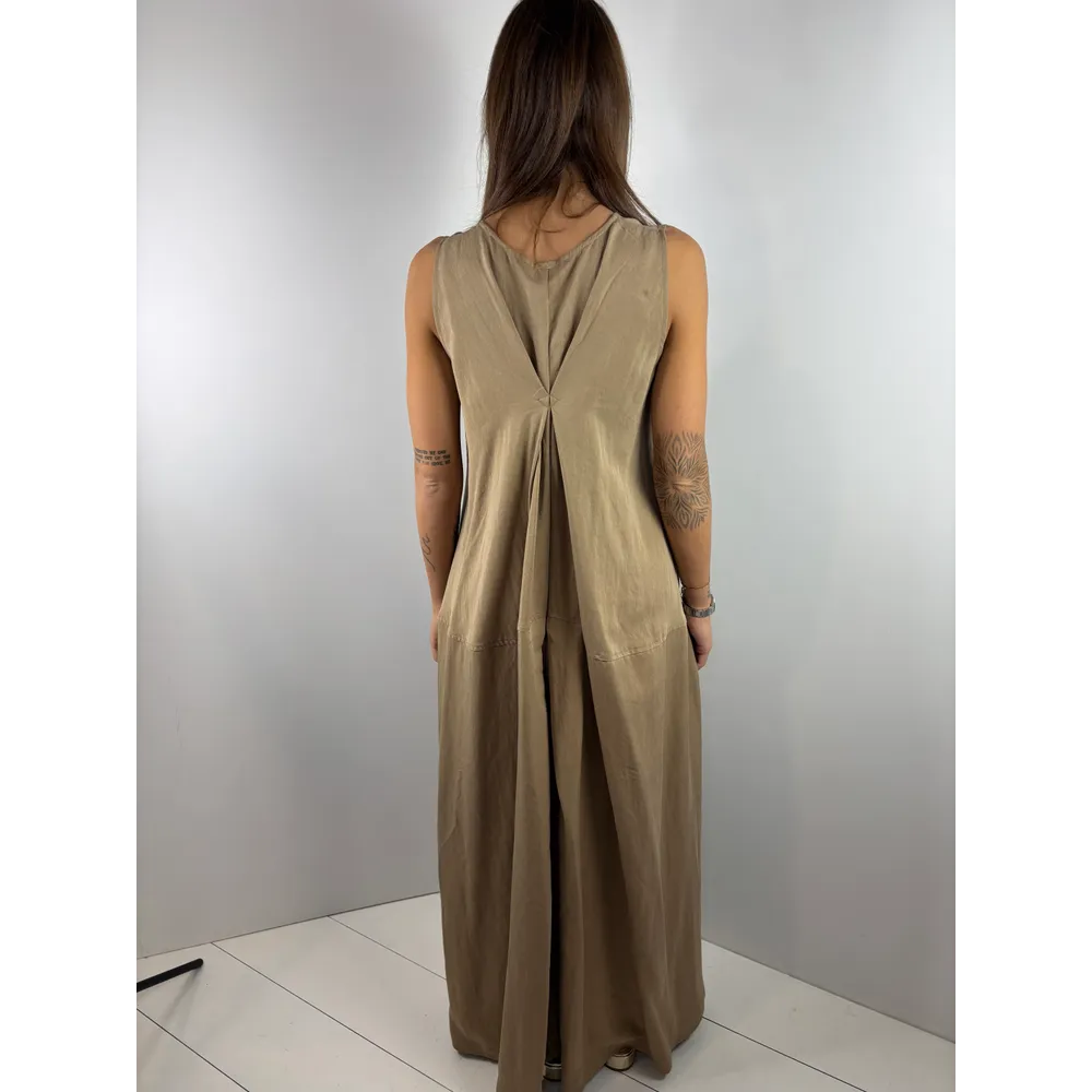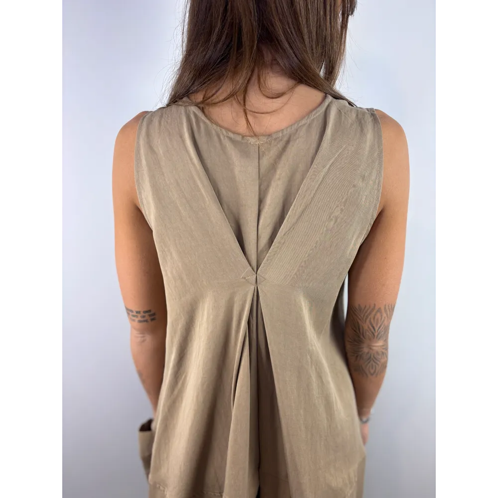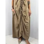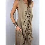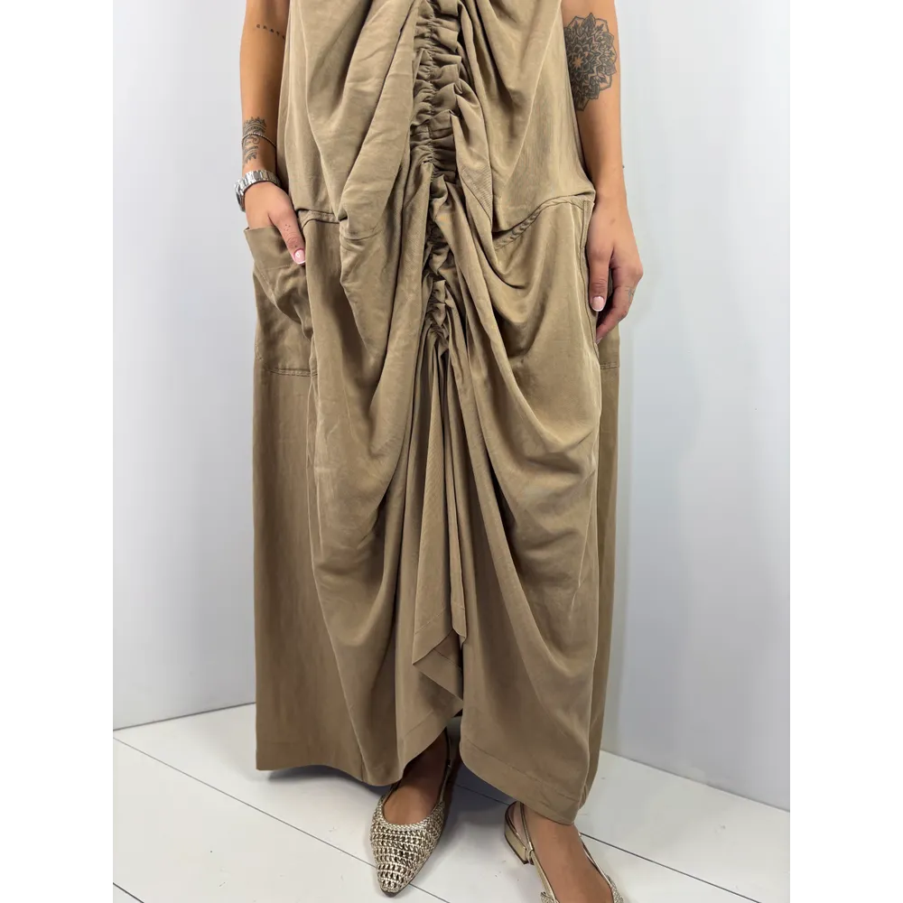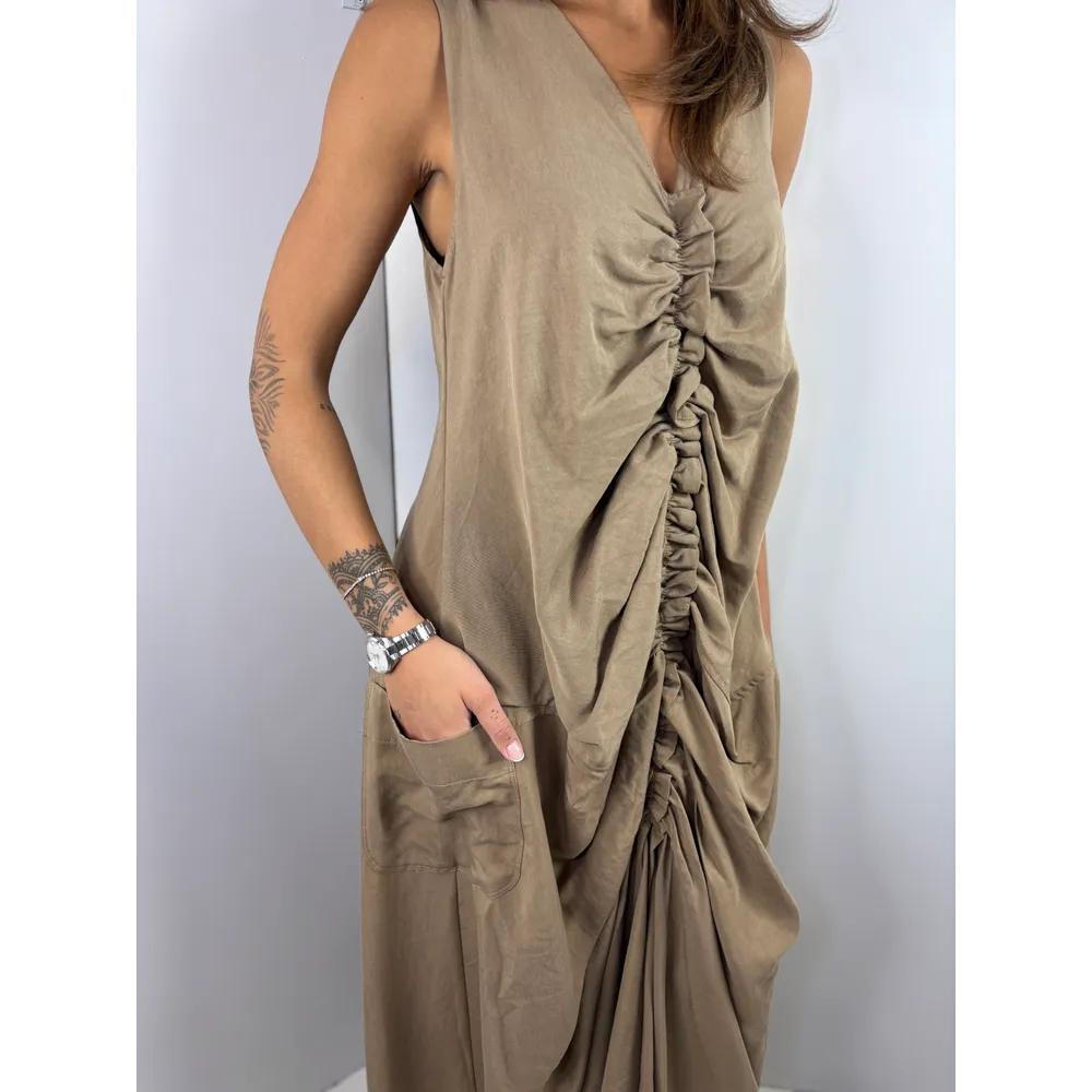 Abito smanicato lungo e ampio con tasche, arricciato sul davanti.