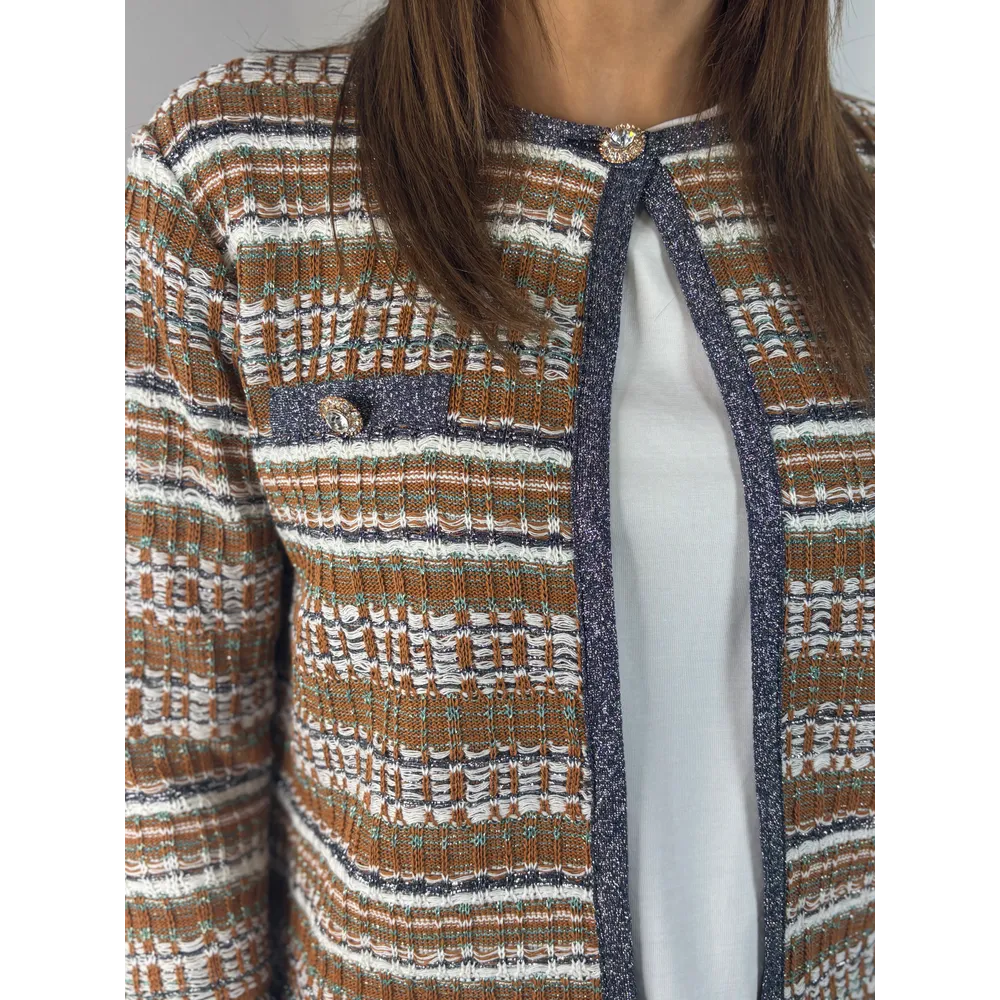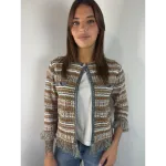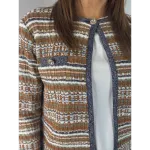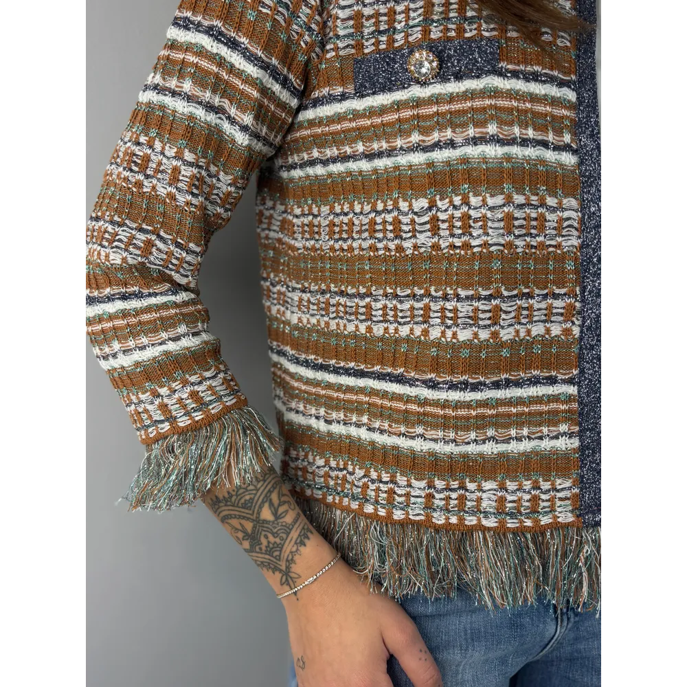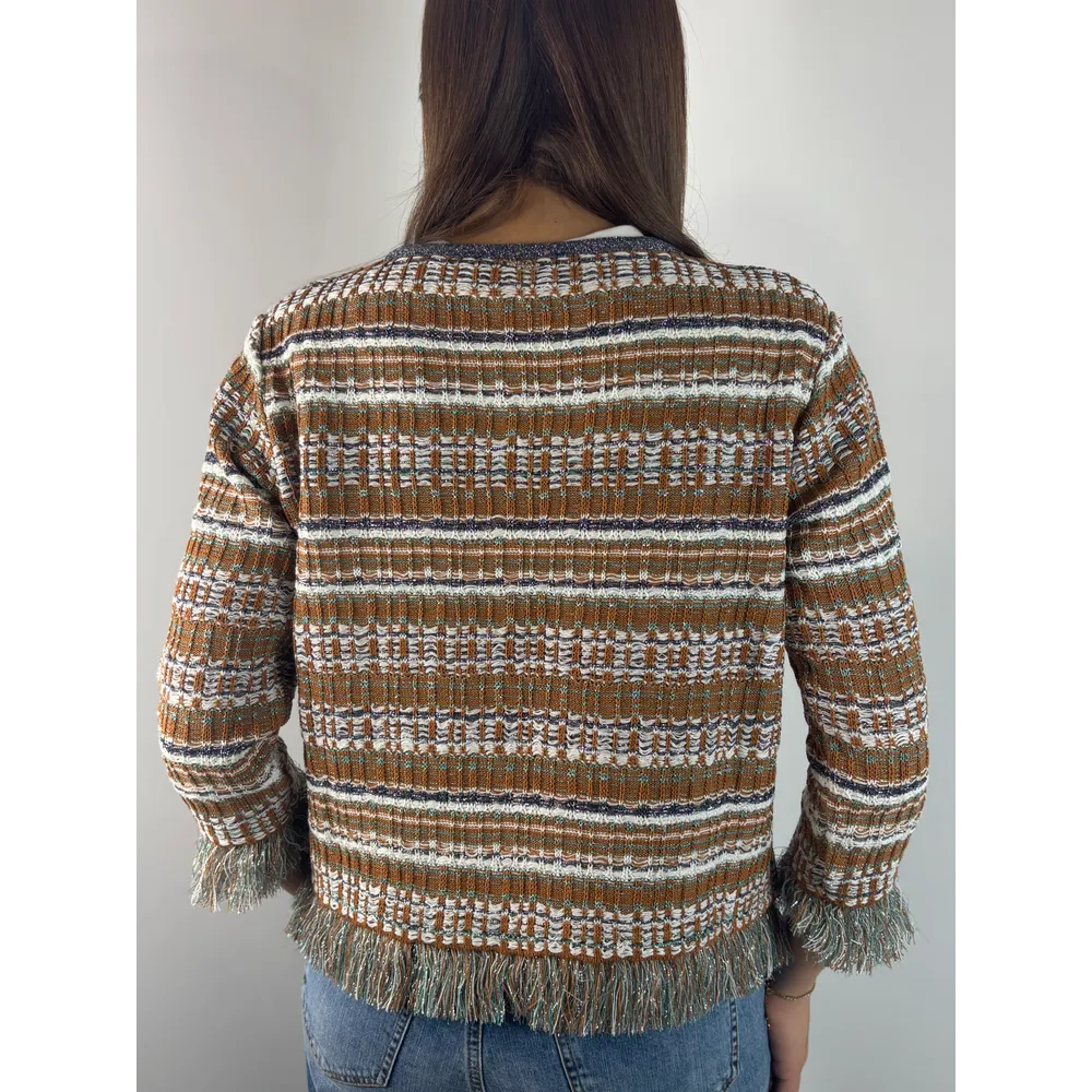Chanel con frange su polsi e fondo e multicolor e filo di lurex. Bottoni gioiello.