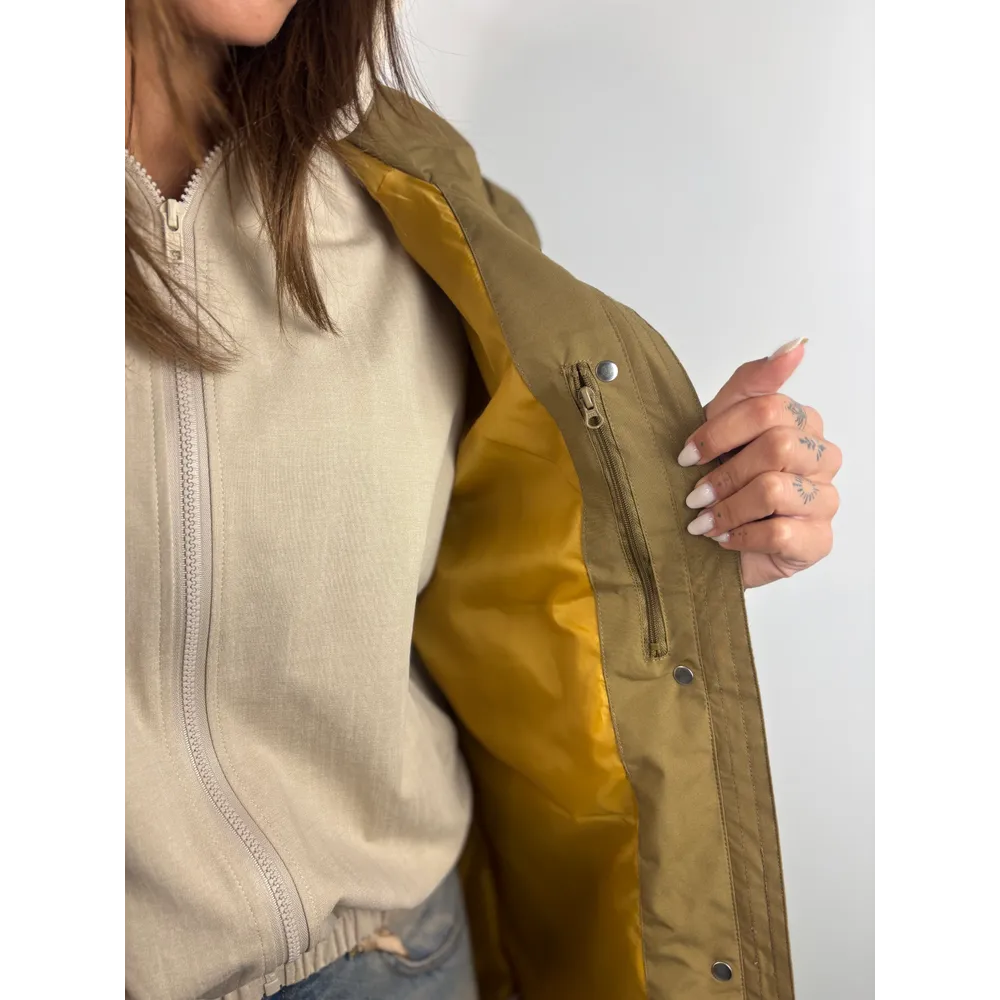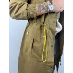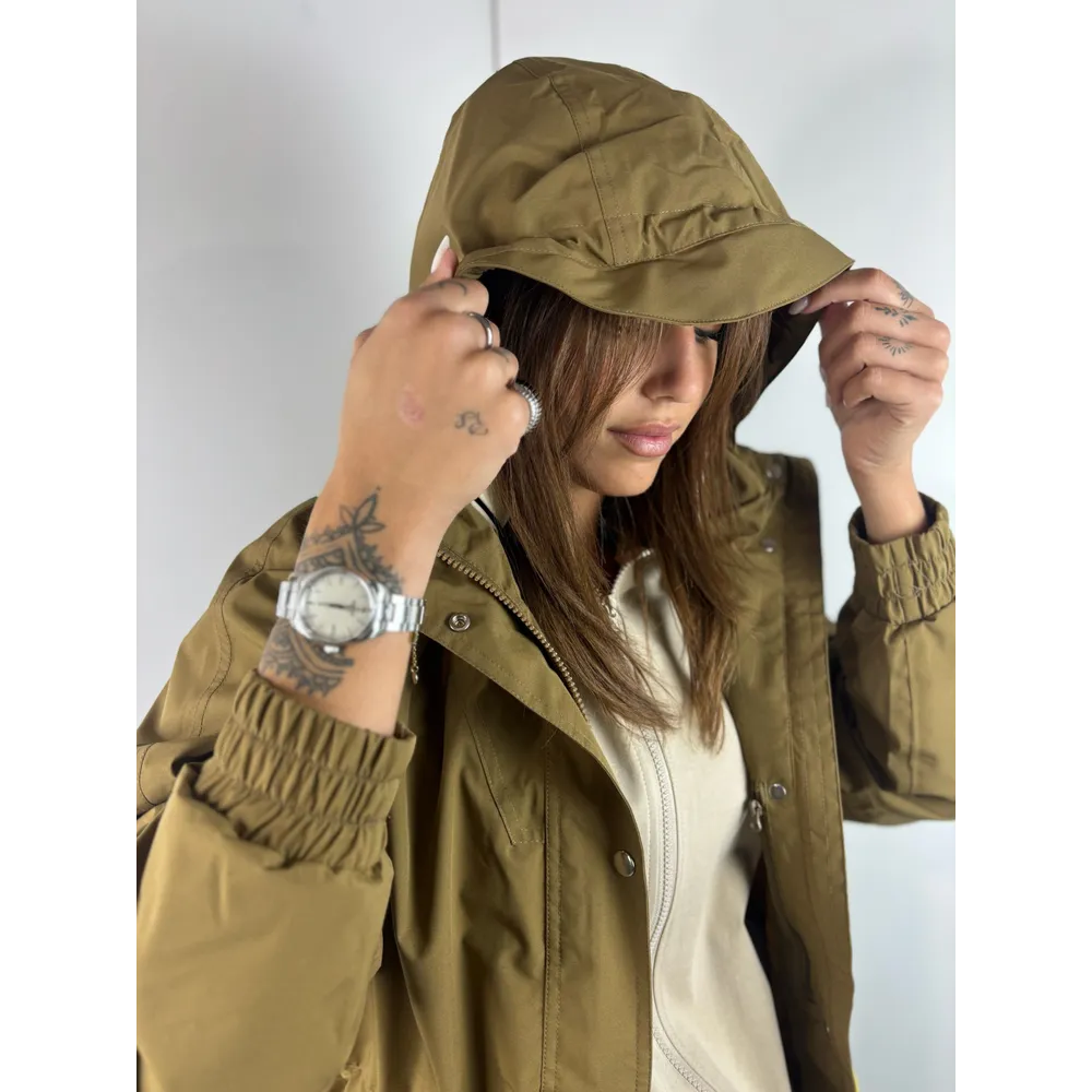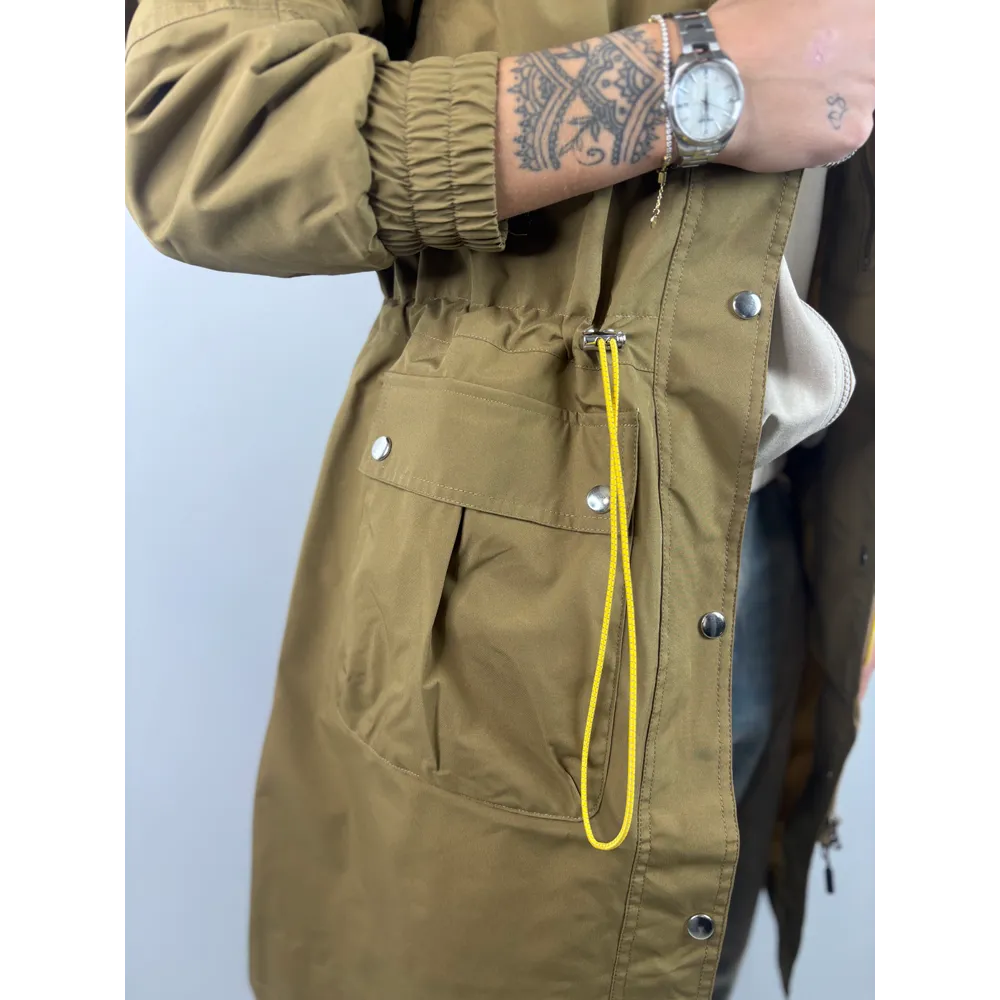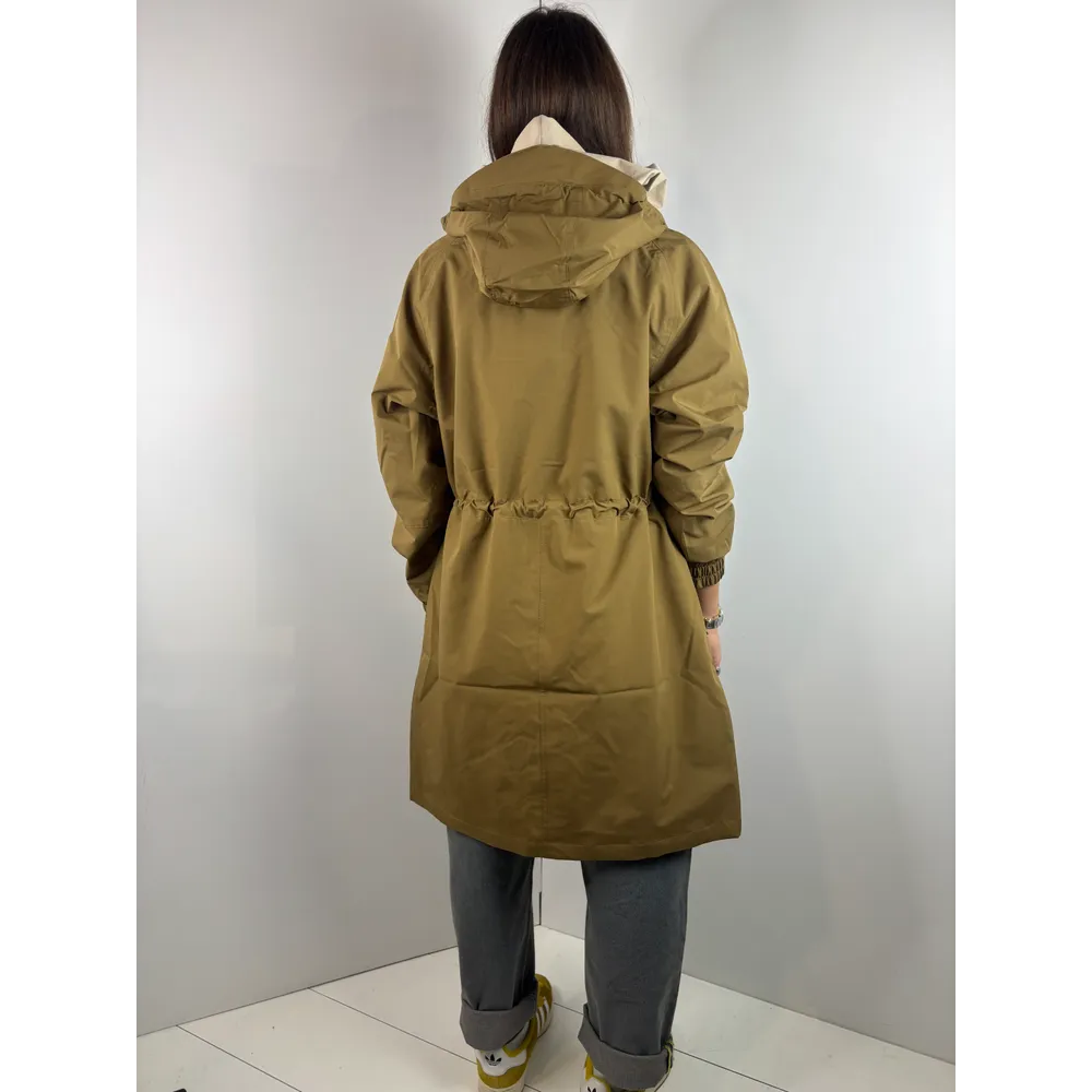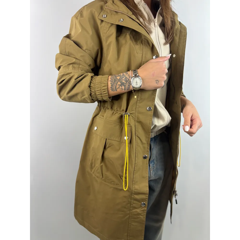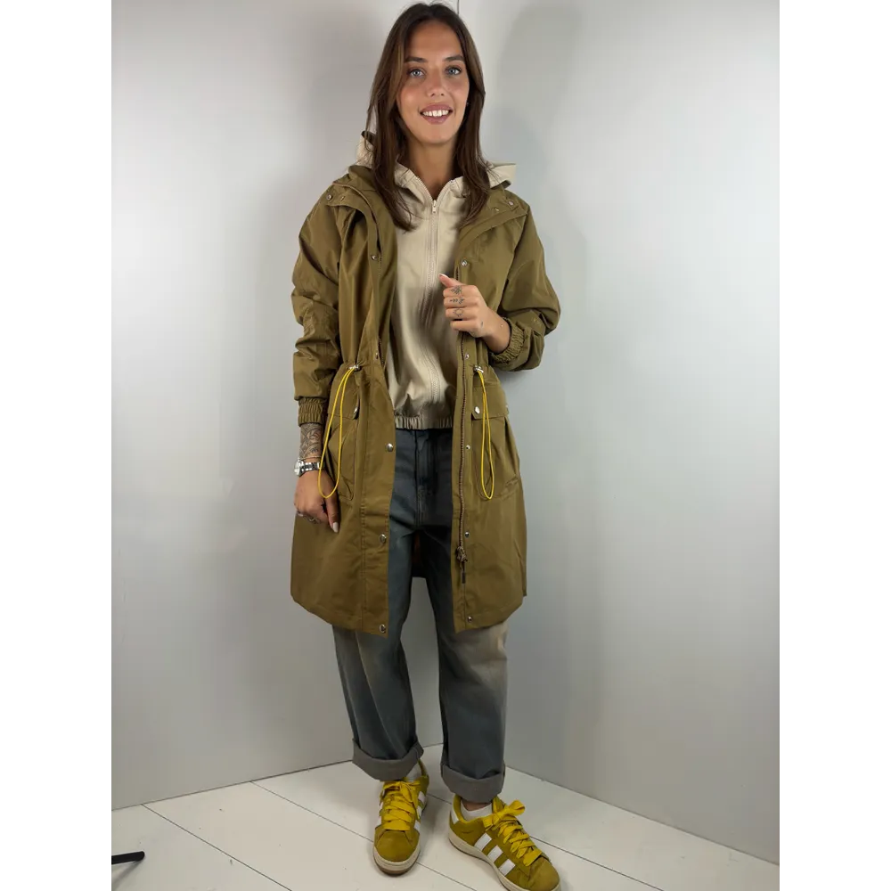 Trench lungo con coulisse e cappuccio, polsi con elastico.