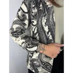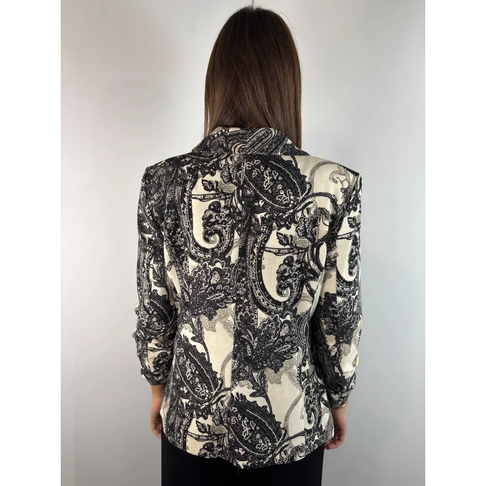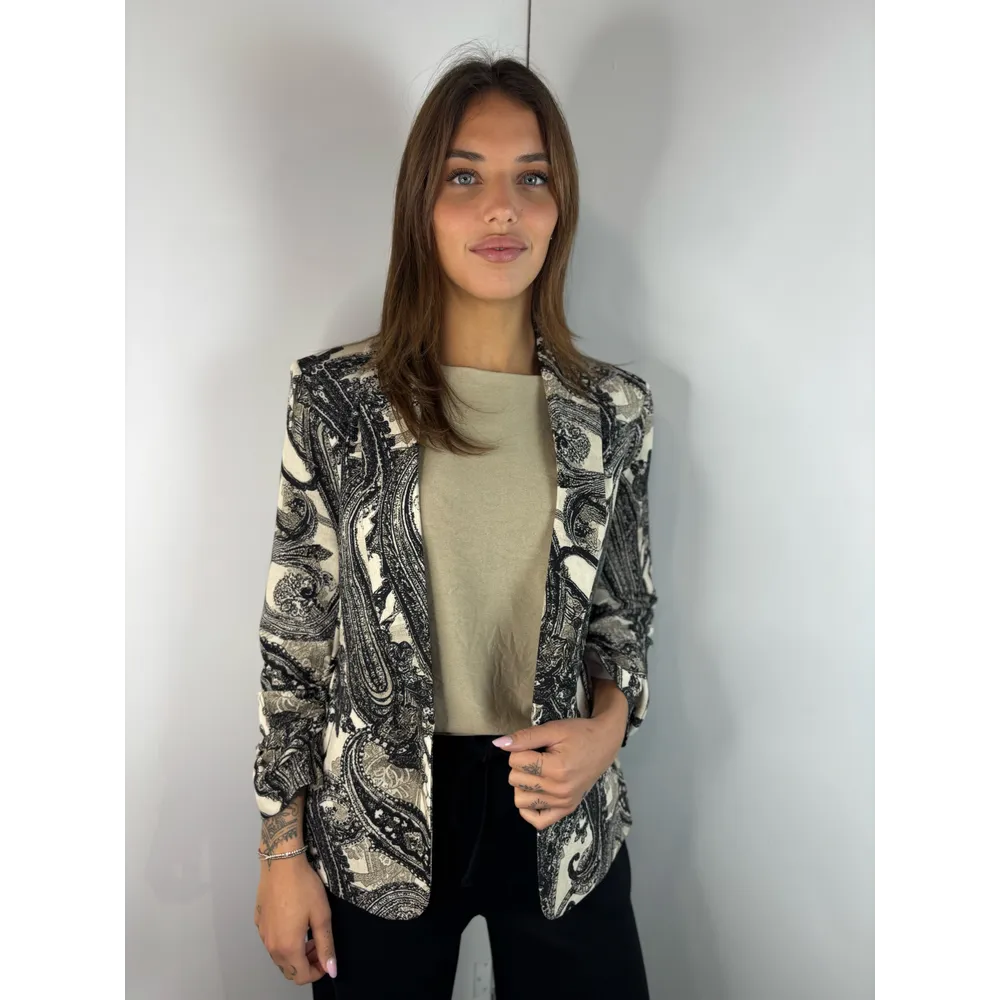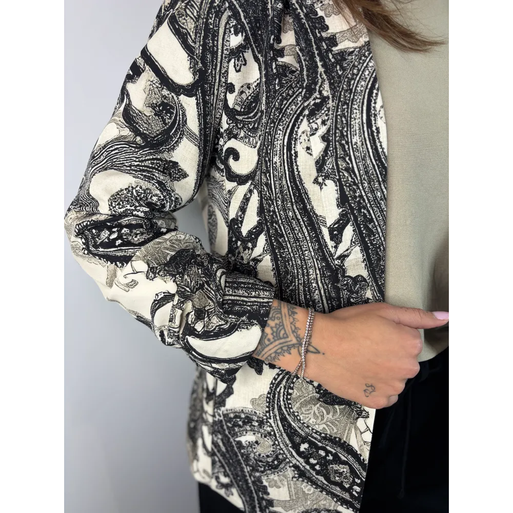 Giacca in fluido fantasia nera su avorio. Maniche arricciate.