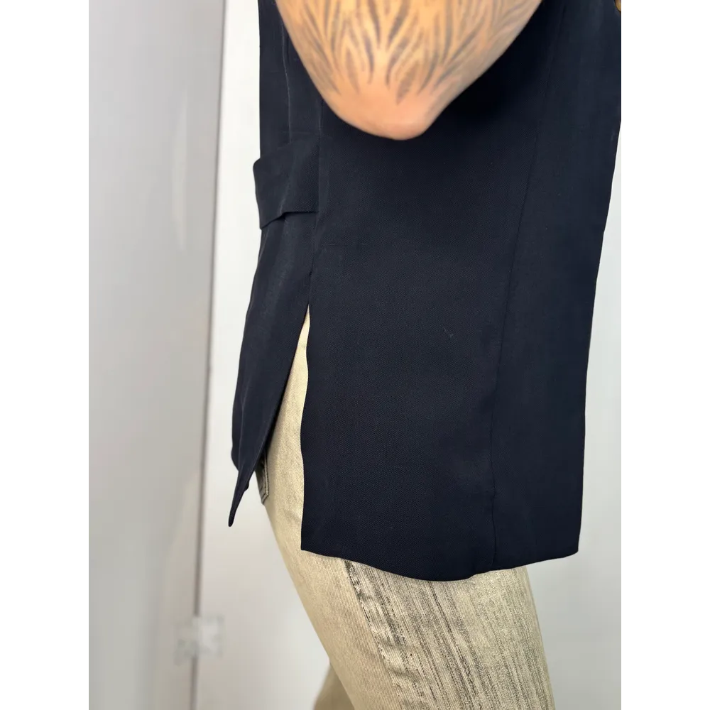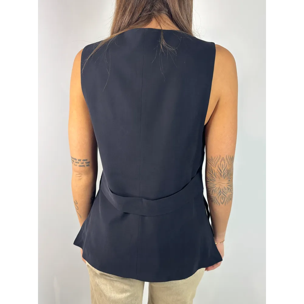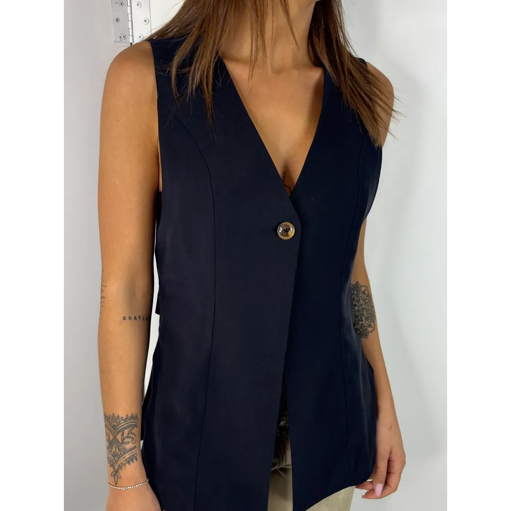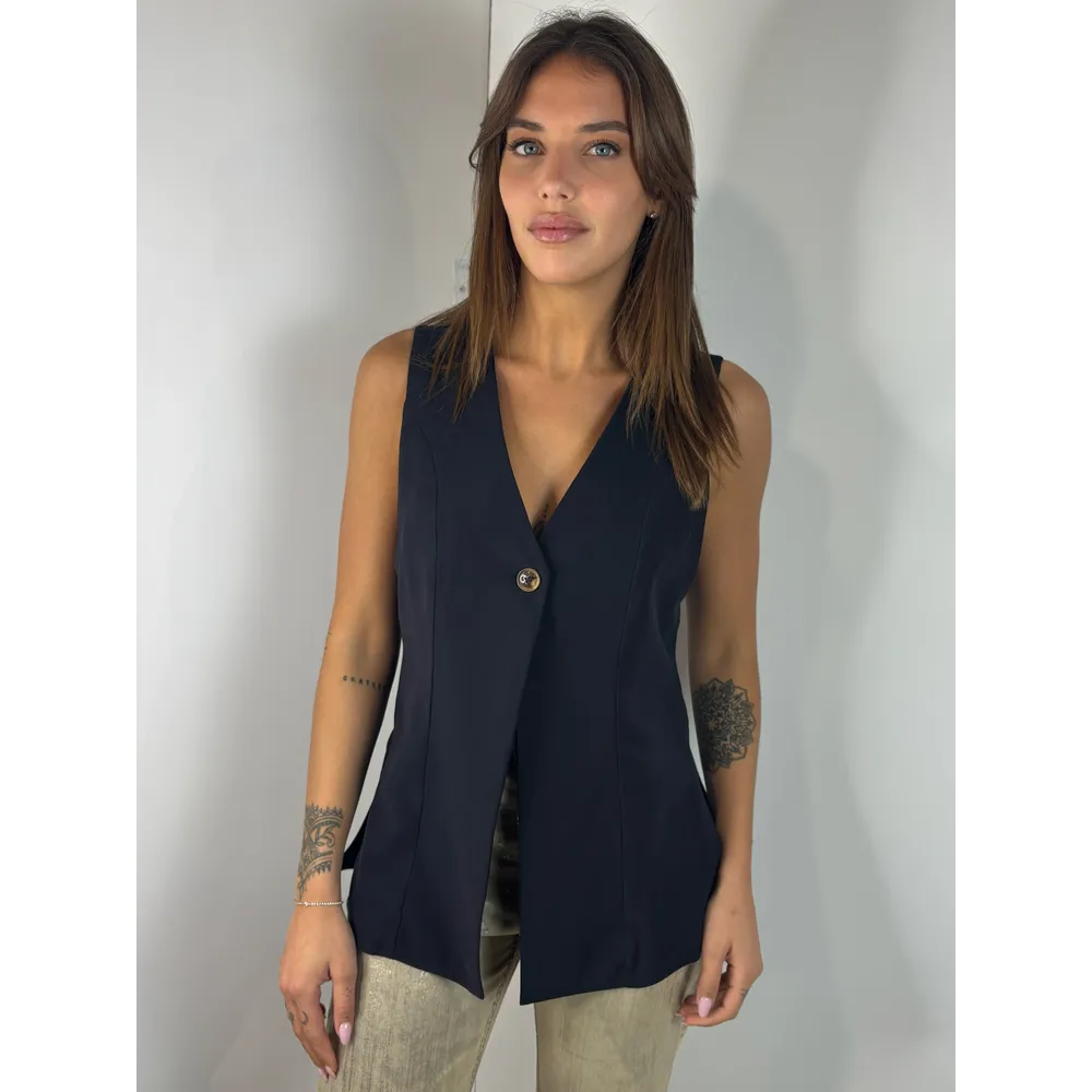 Gilet lungo con spacchi laterali, un bottone e martingala.