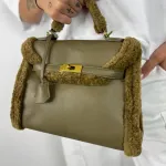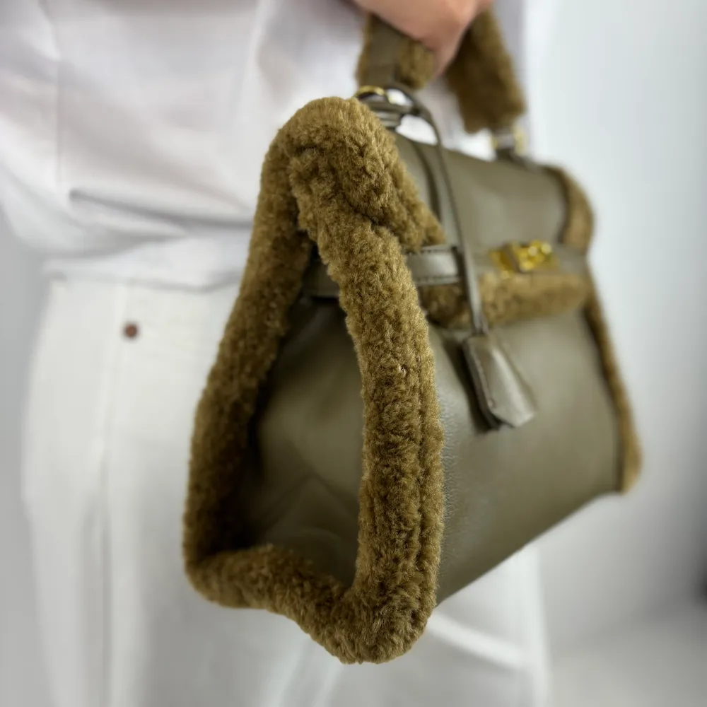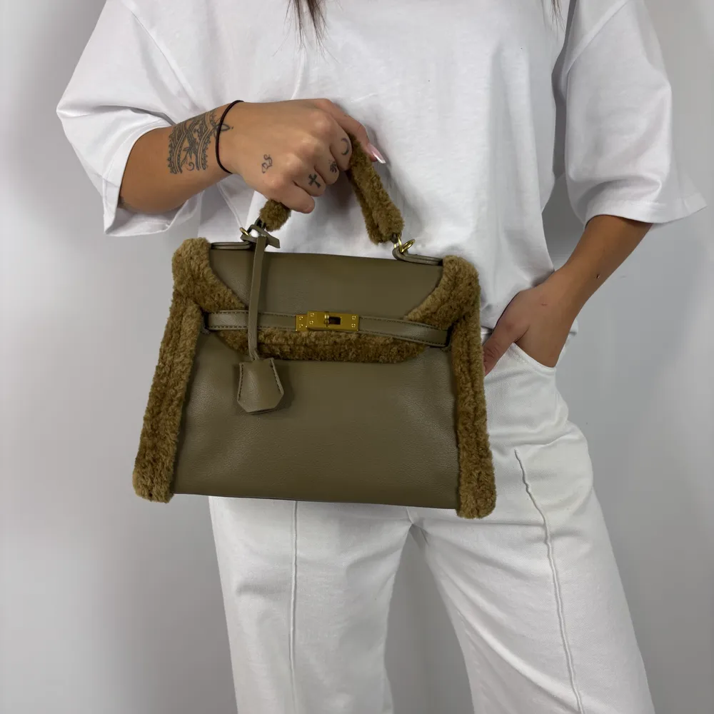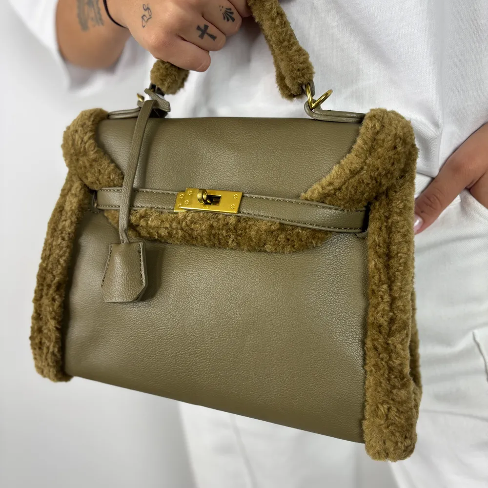 Borsa verde oliva con bordi in ecopelliccia con manico e tracolla.