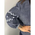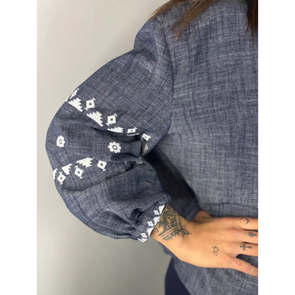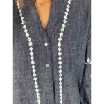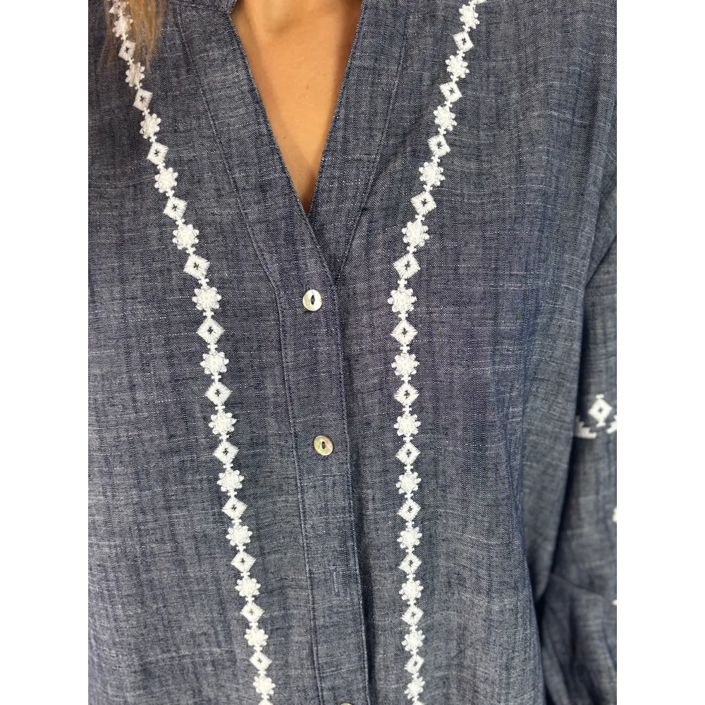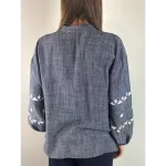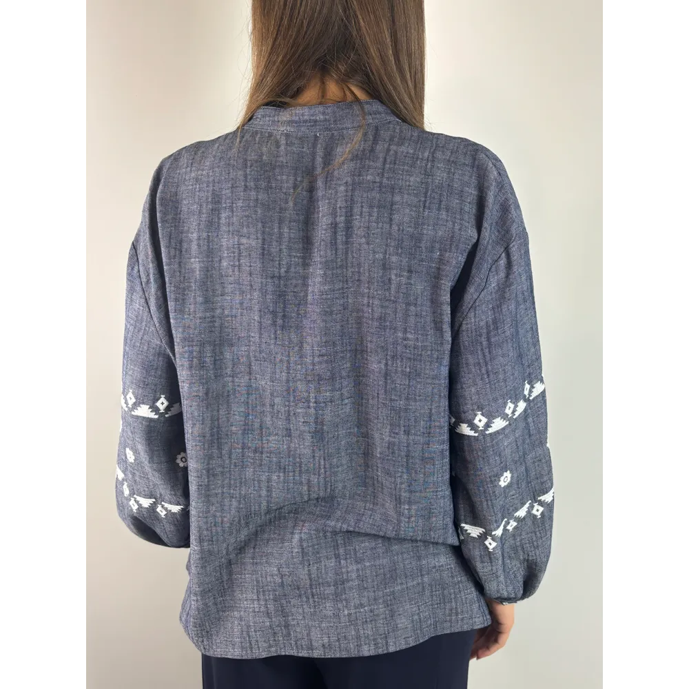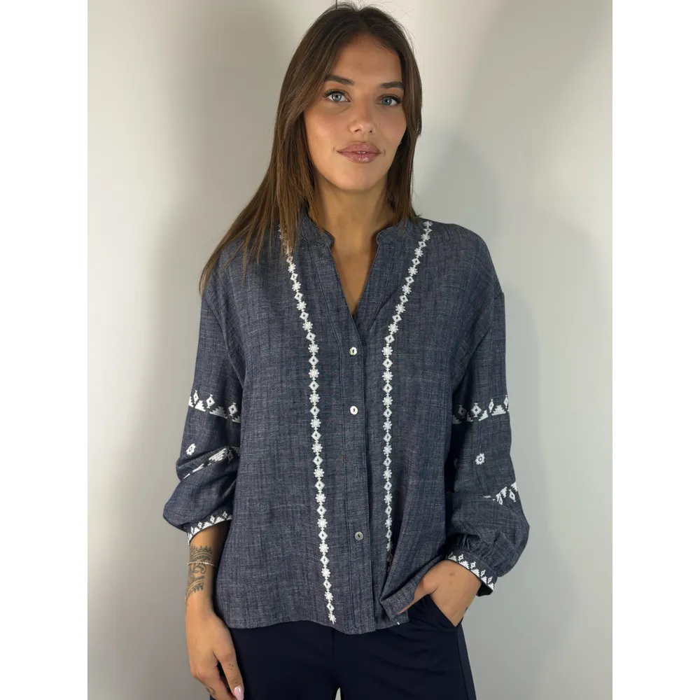 Camicia scollata a V con ricami in contrasto. Maniche ampie chiuse con polsino.
