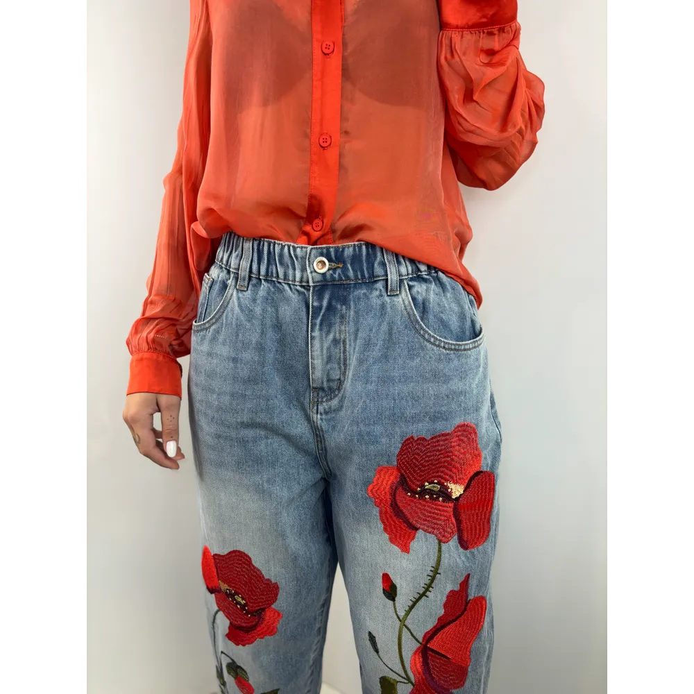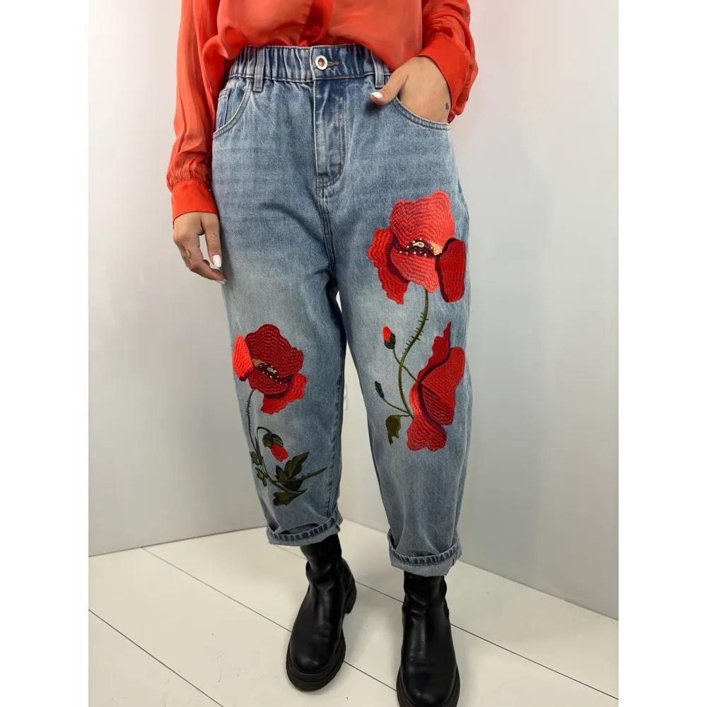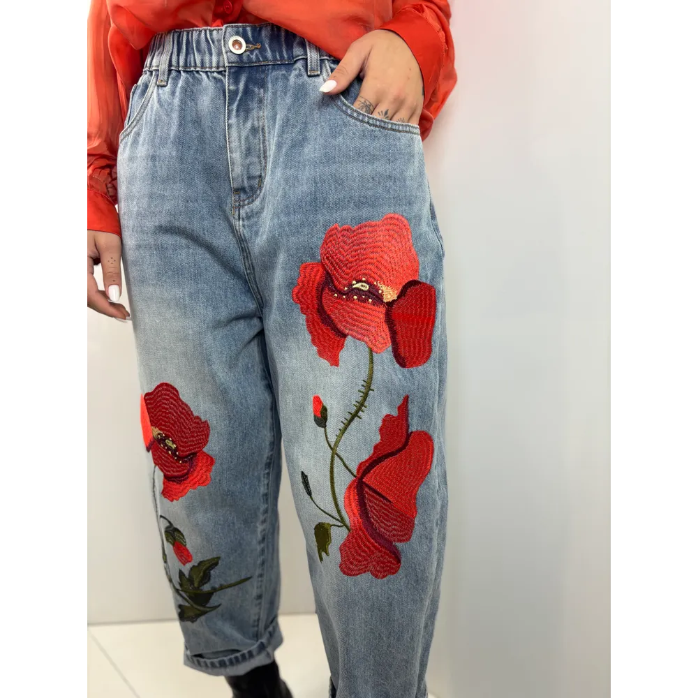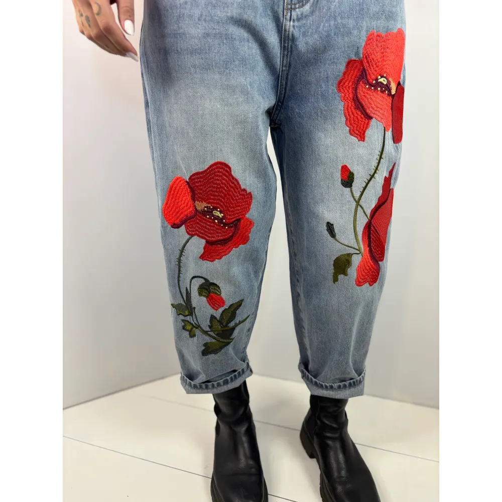 Jeans in denim con ricamo papavero.