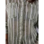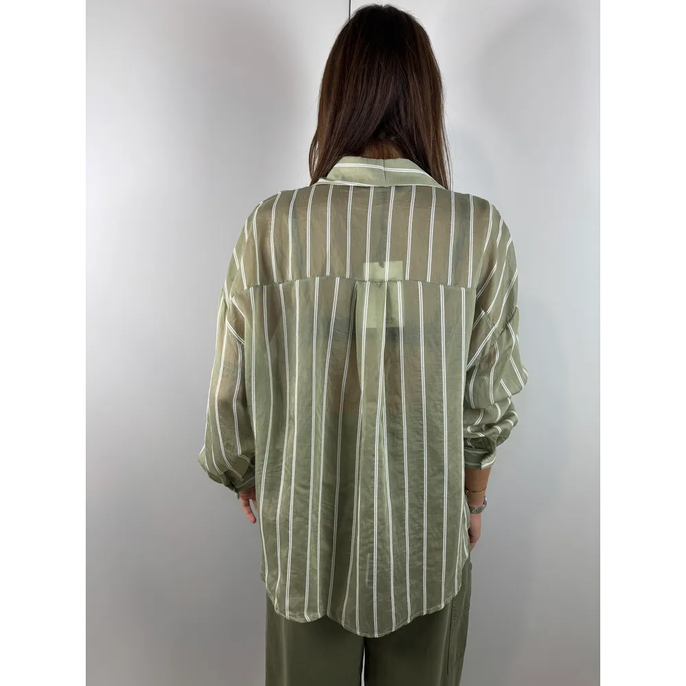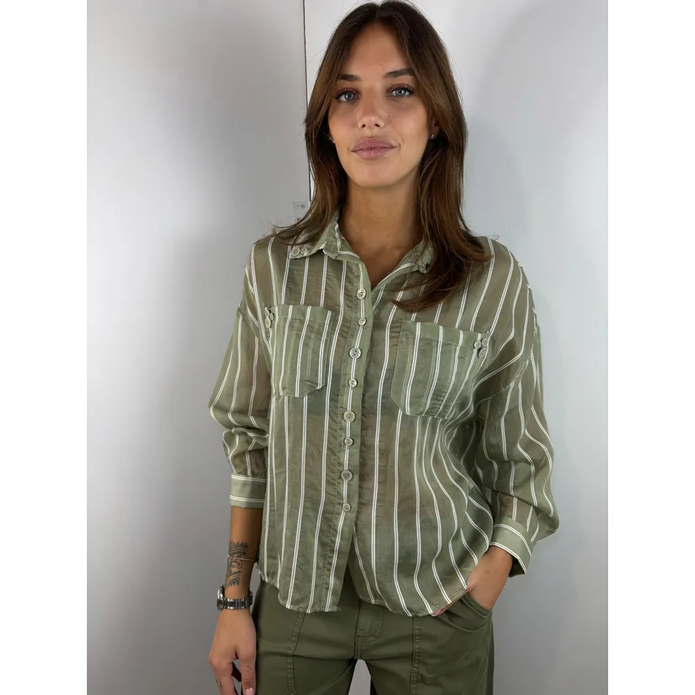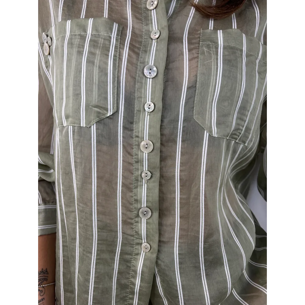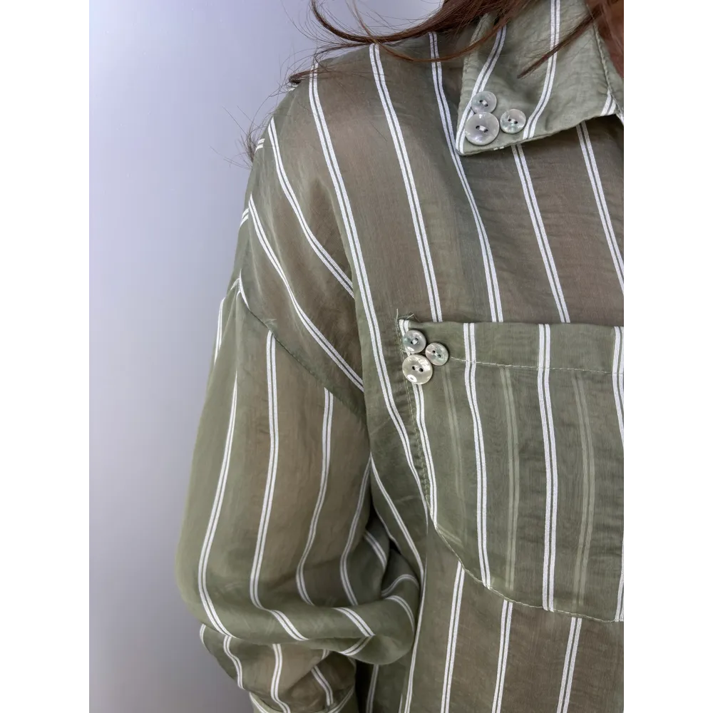 Camicia verde salvia gessata burro leggera con bottoncini su taschini e colletto come abbellimento.