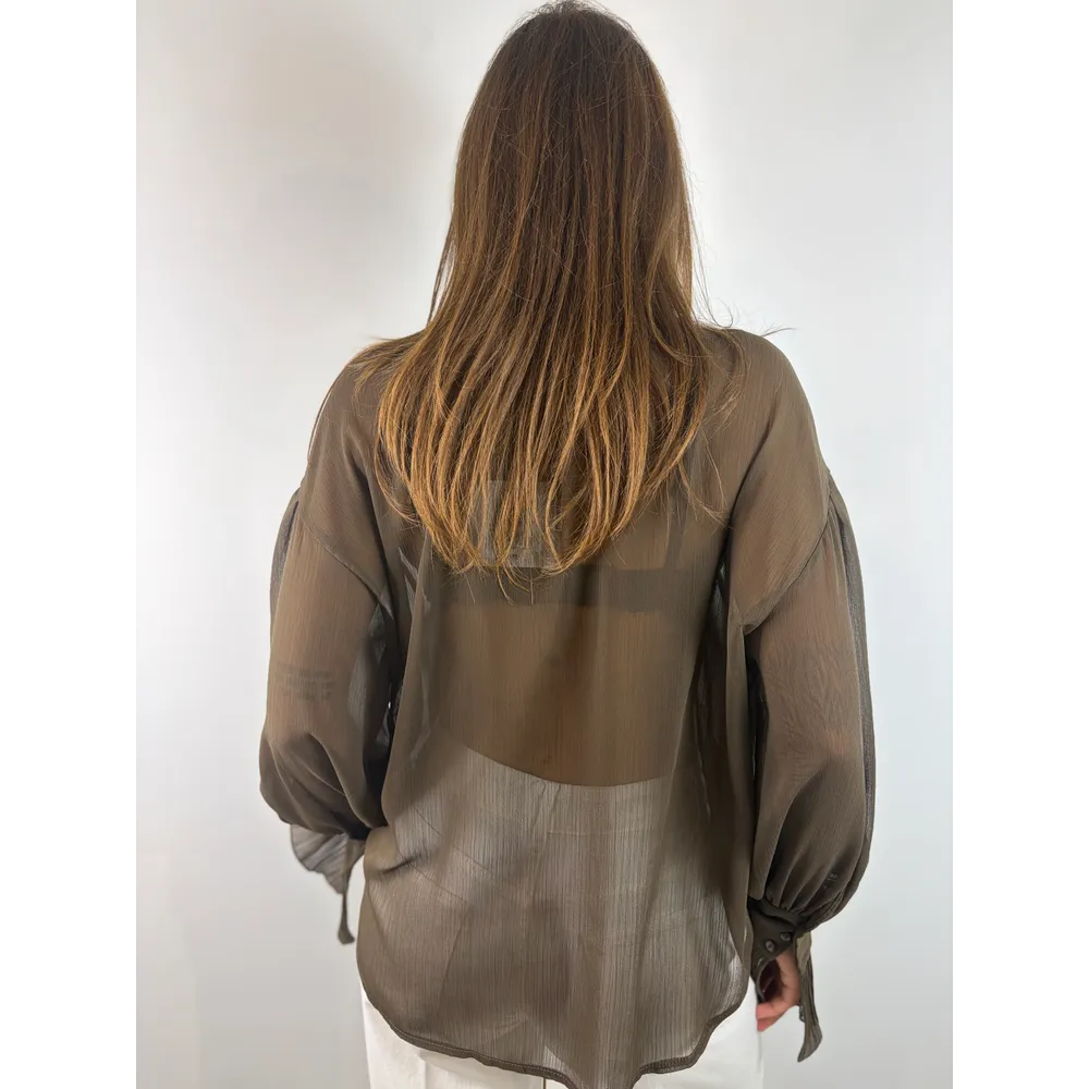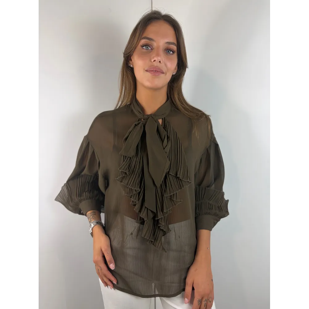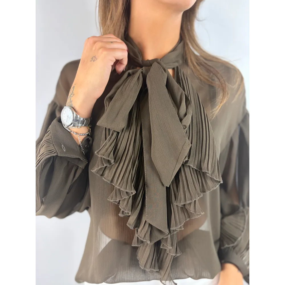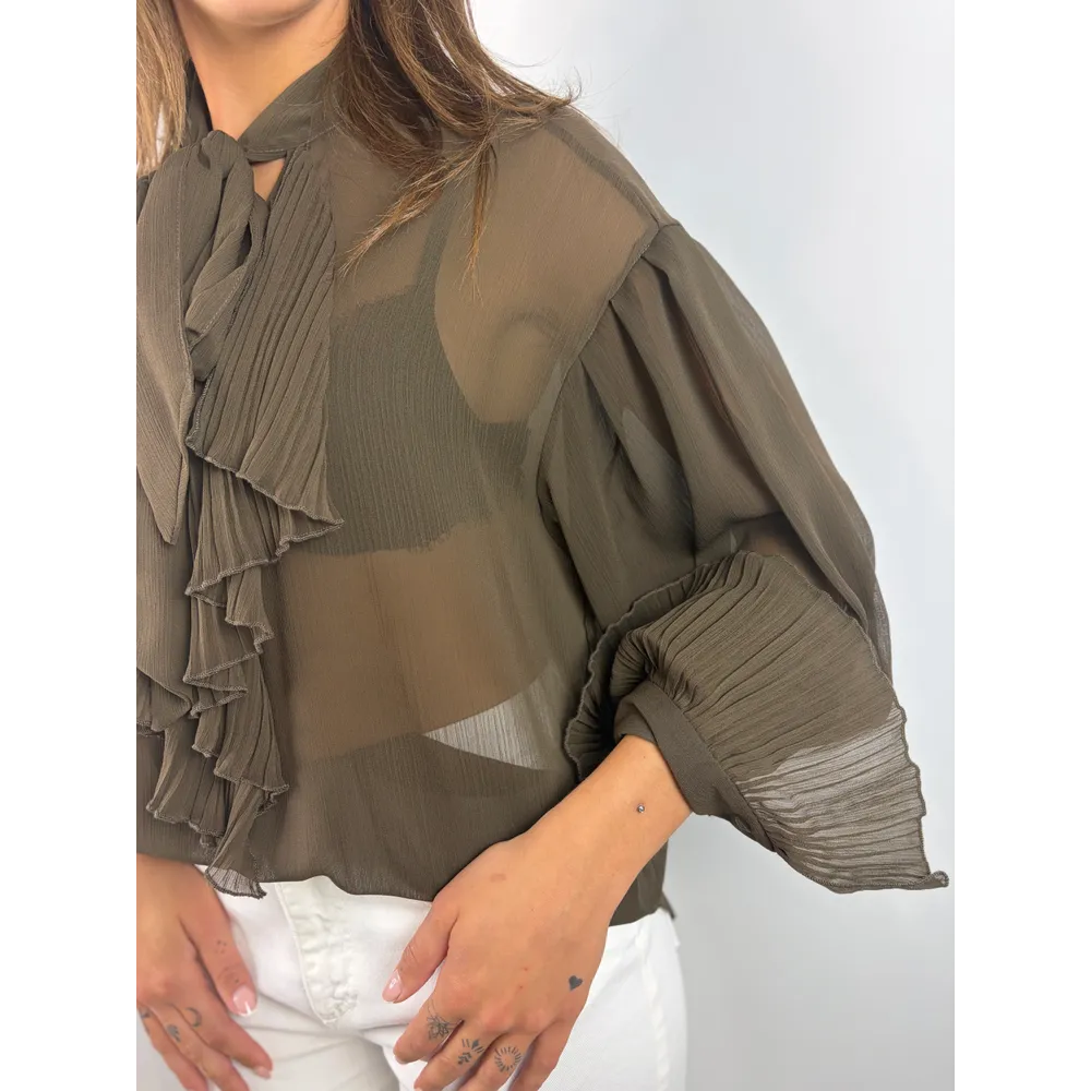 Blusa moro con scollo a V, rouges plissé sul davanti e sui polsi.