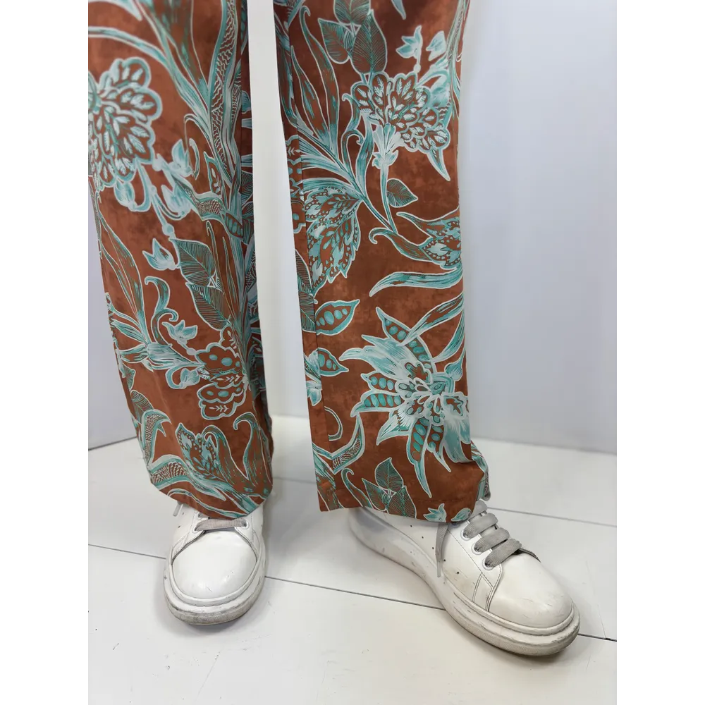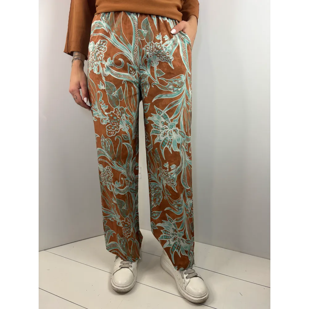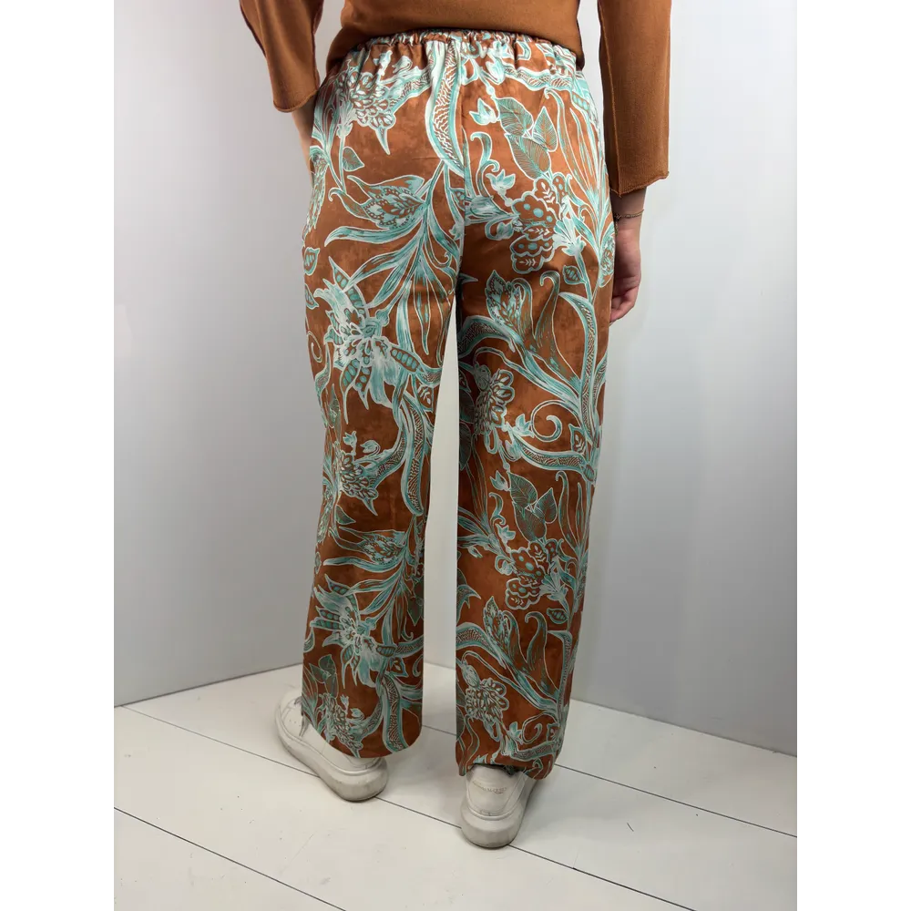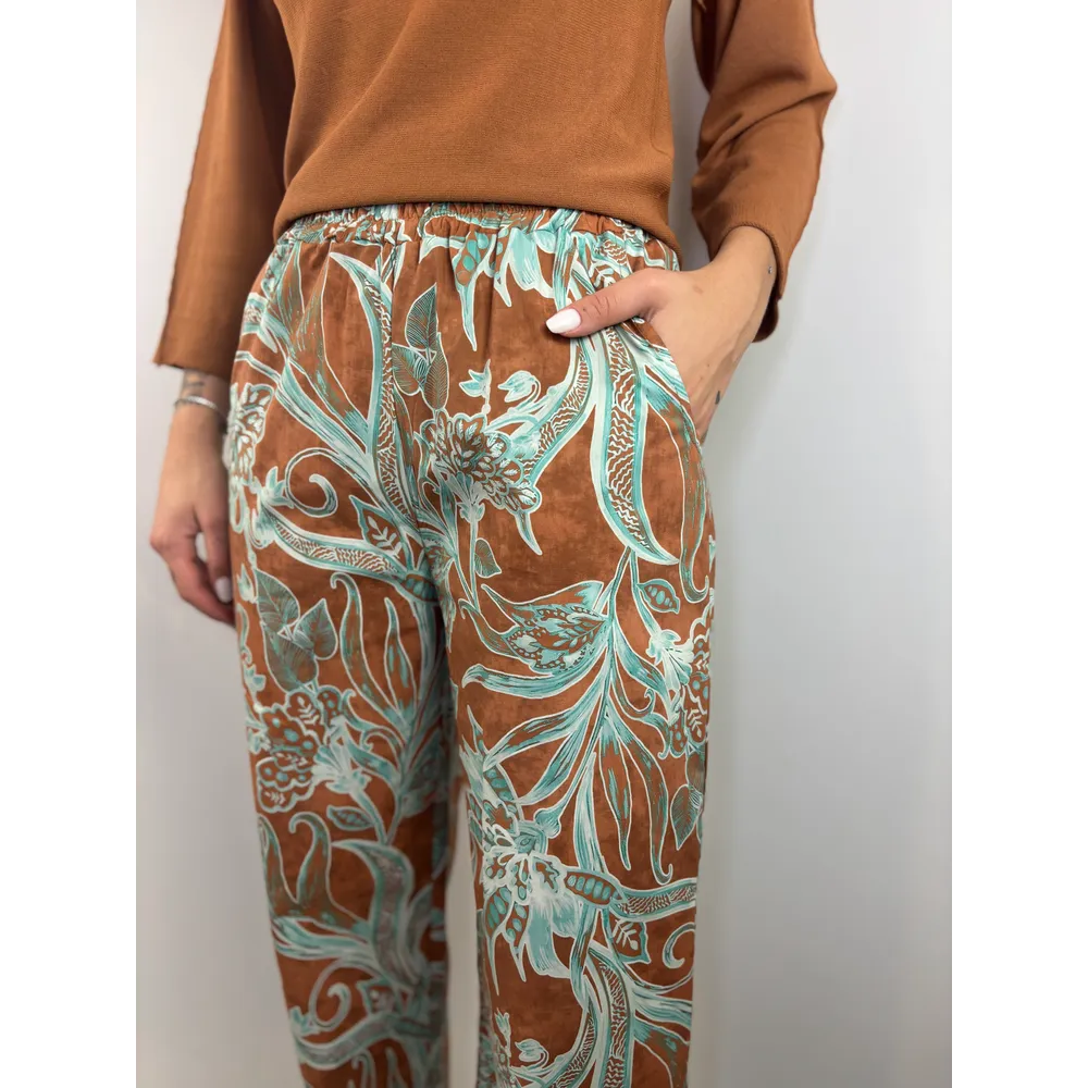 Pantalone ampio fantasia foglie , verde acqua/coccio.
