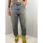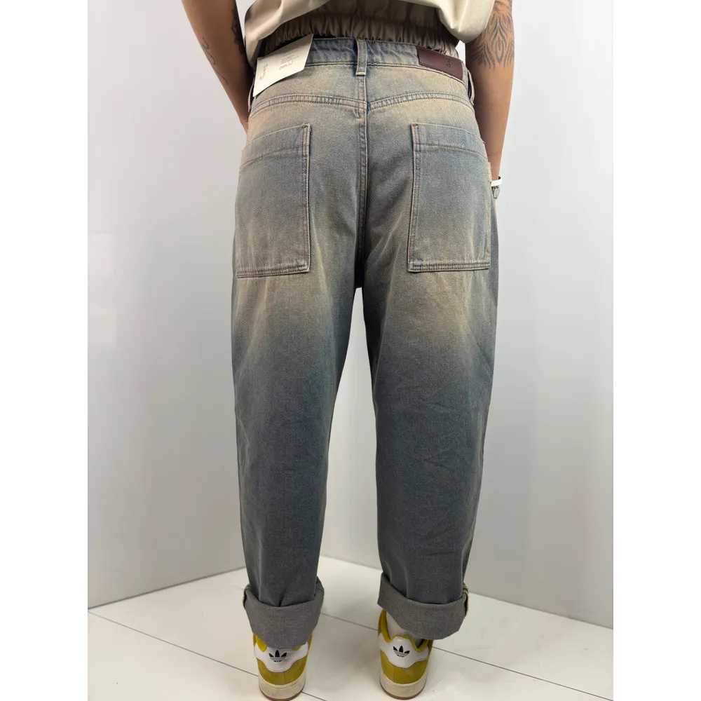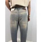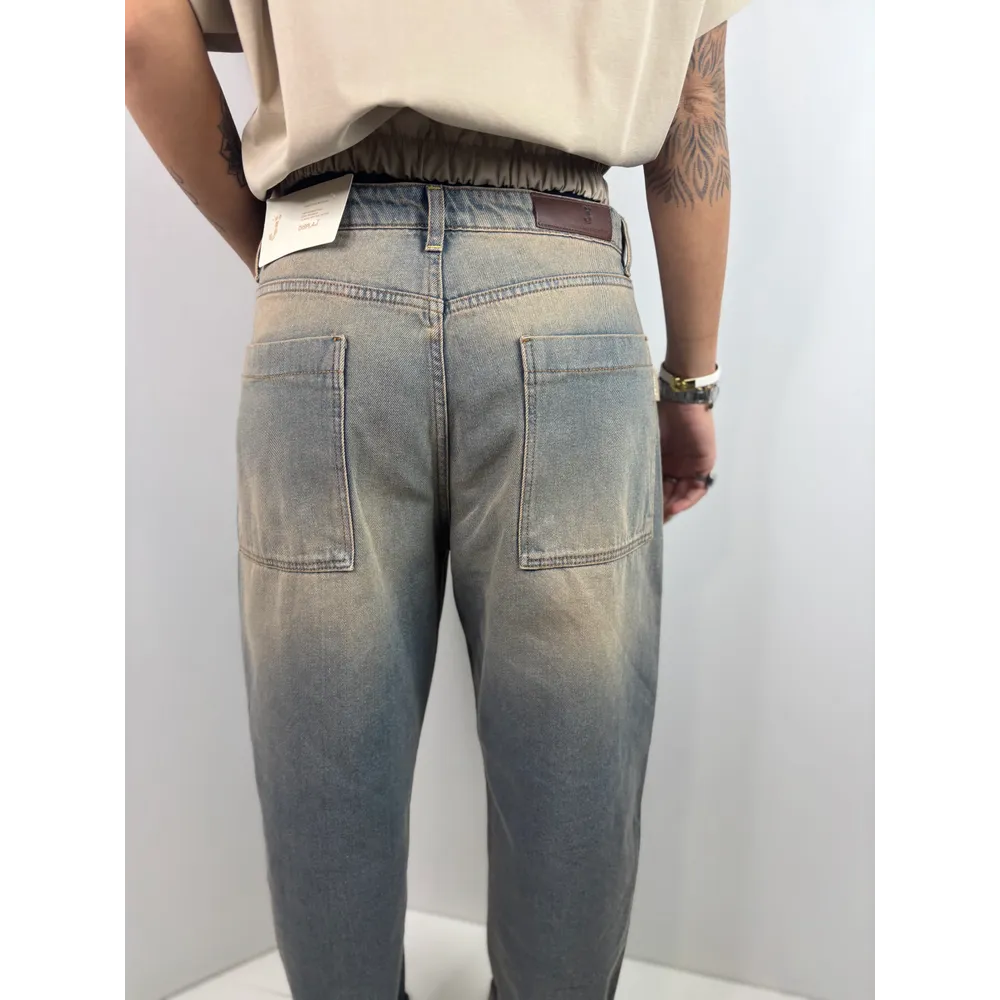 Jeans sabbiato modello uomo con cavallo basso e tascone posteriori scesi.