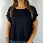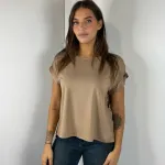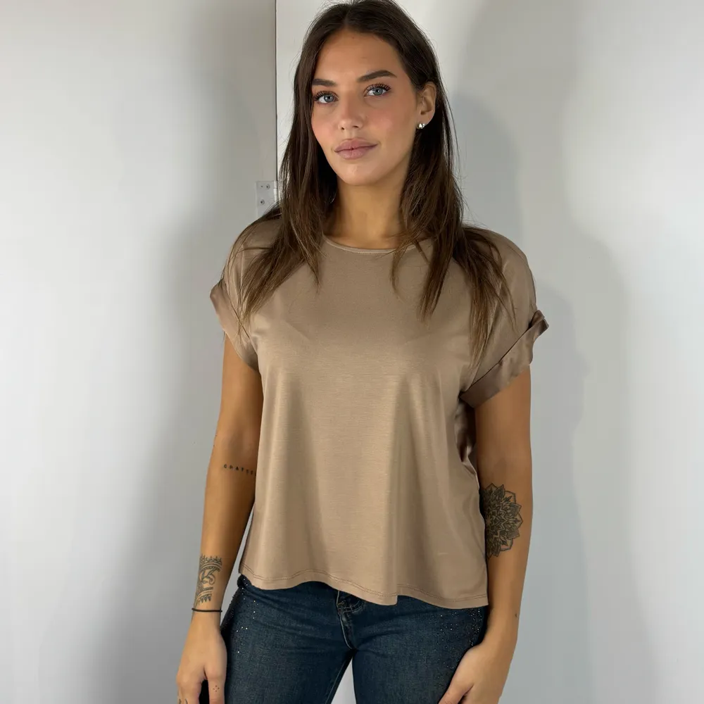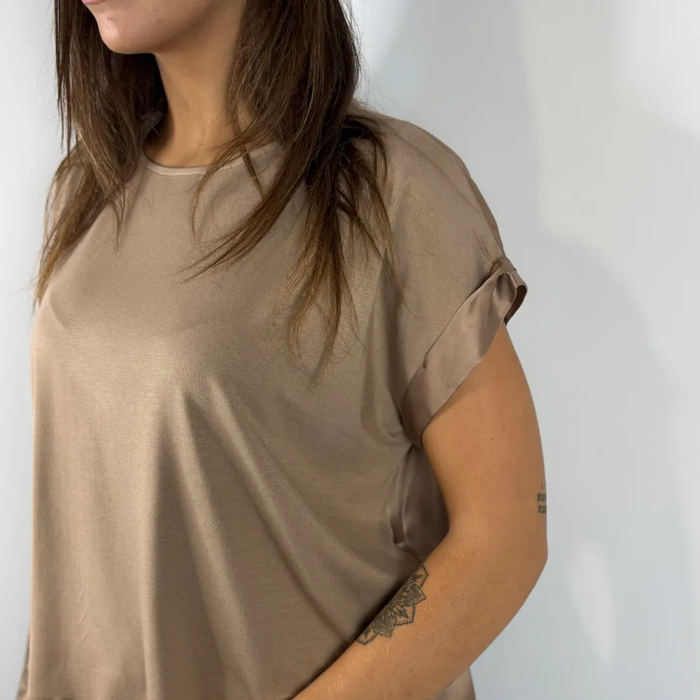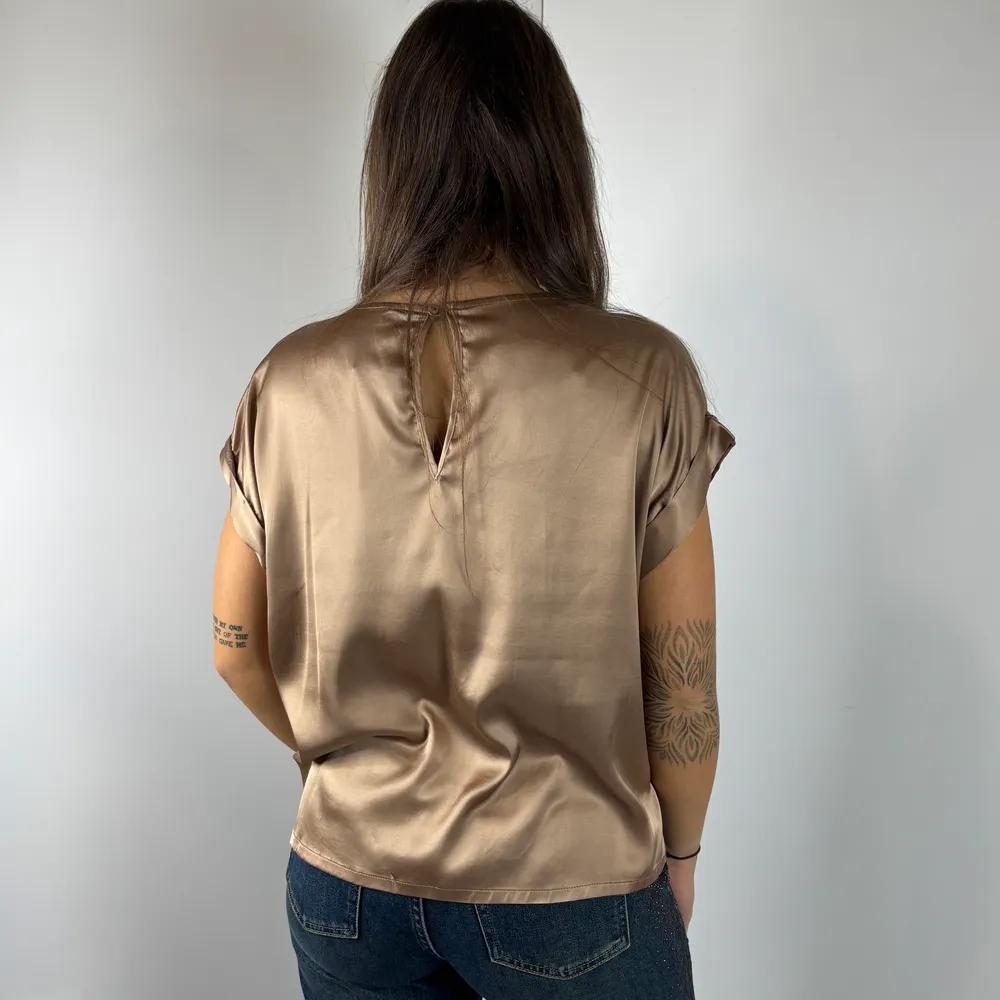 Blusa parte anteriore in maglina, parte posteriore in tessuto lucido. Spalla scesa.
