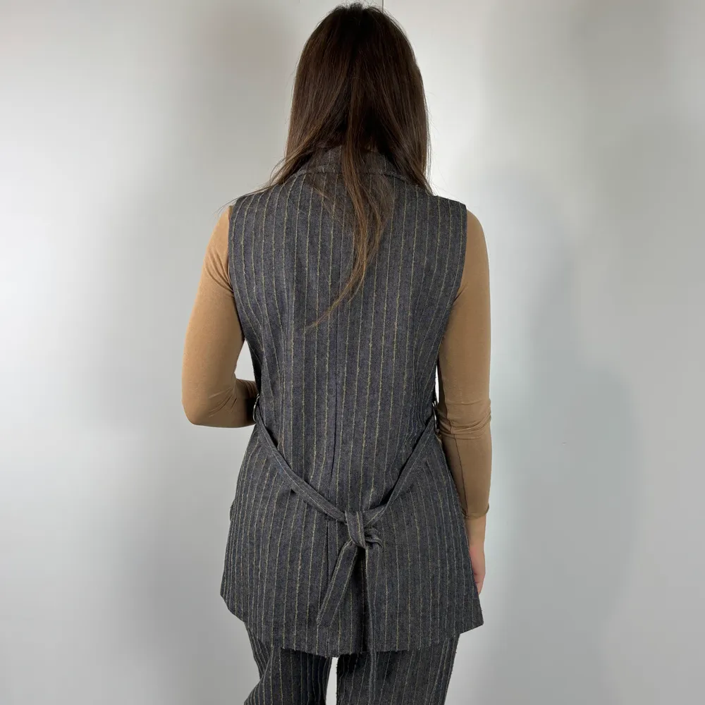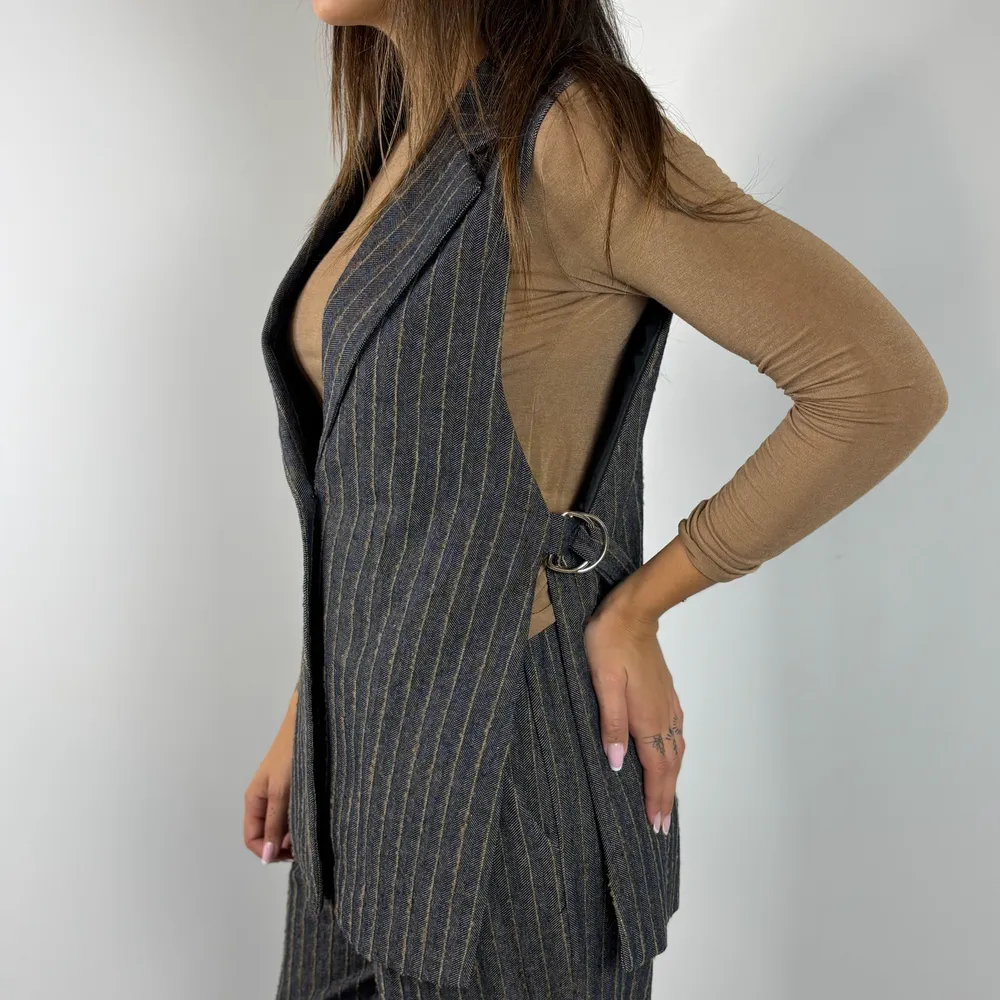 Gilet spinato nero con gessato beige aperto lateralmente con cinghie