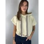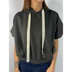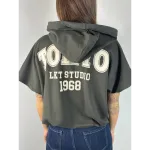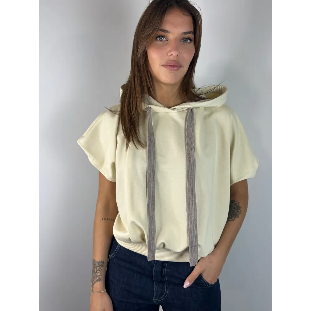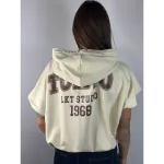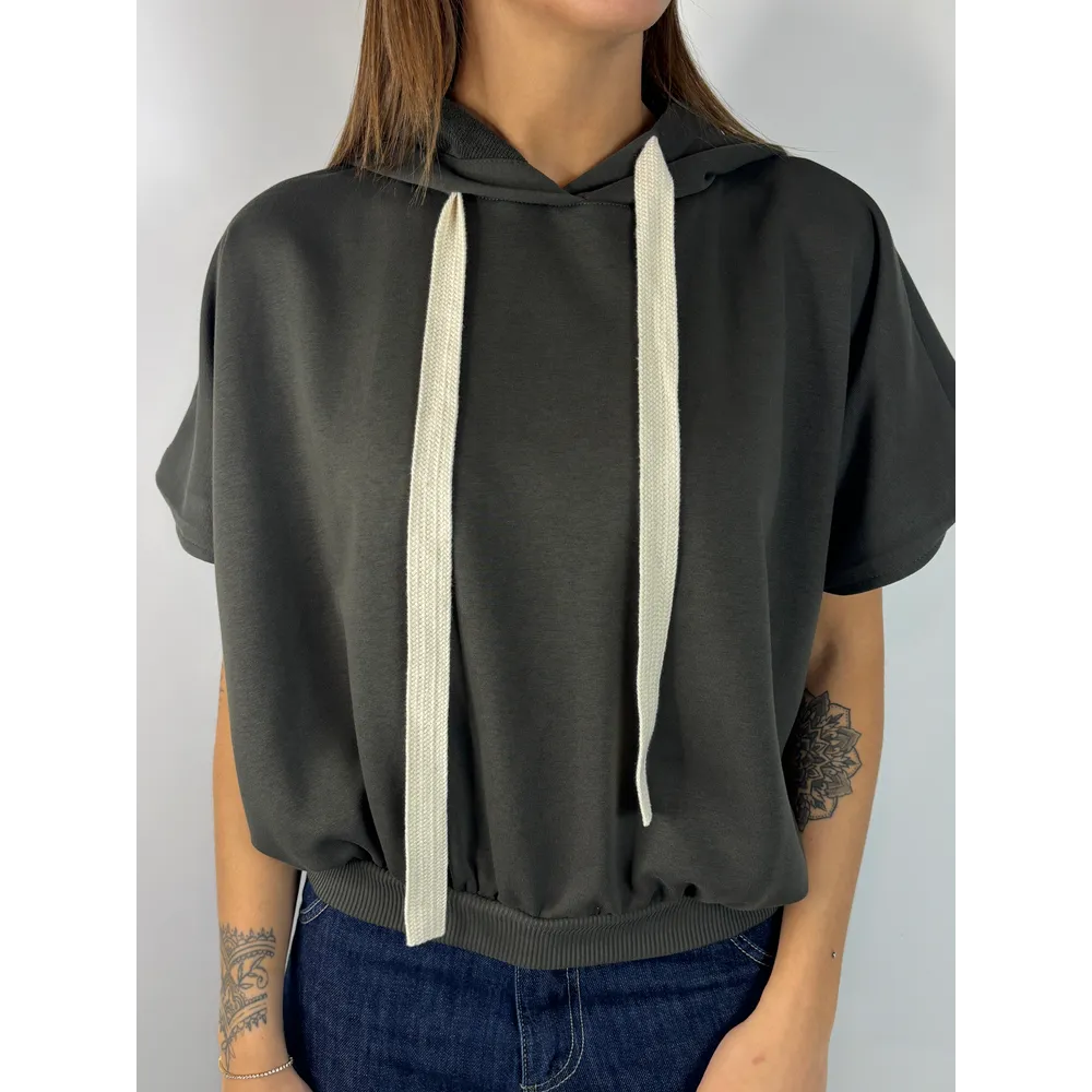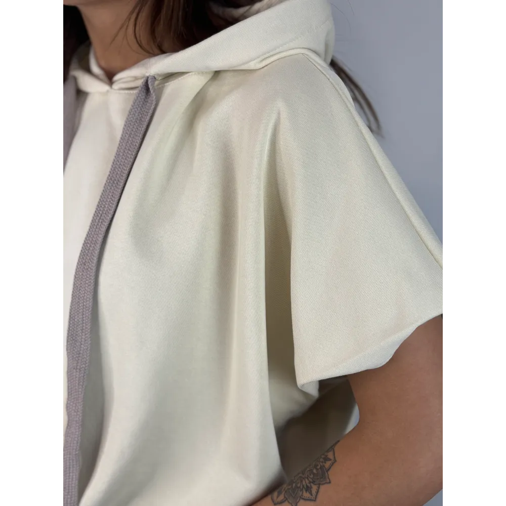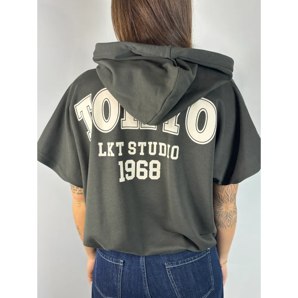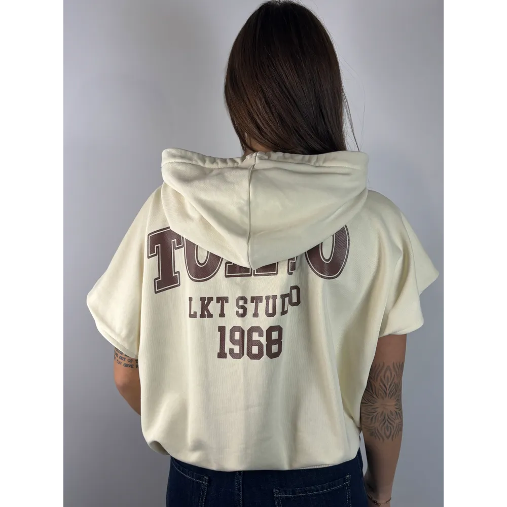 Felpa smanicata con cappuccio, elastico in vita. Stampa schiena.