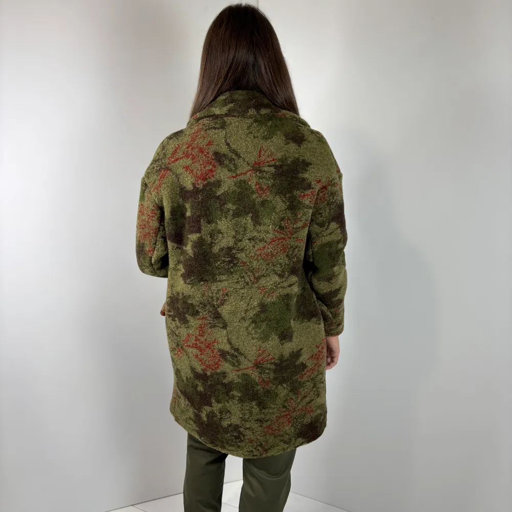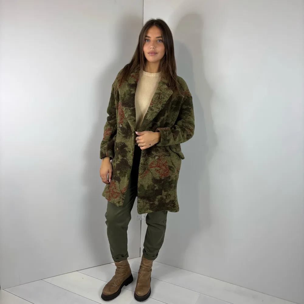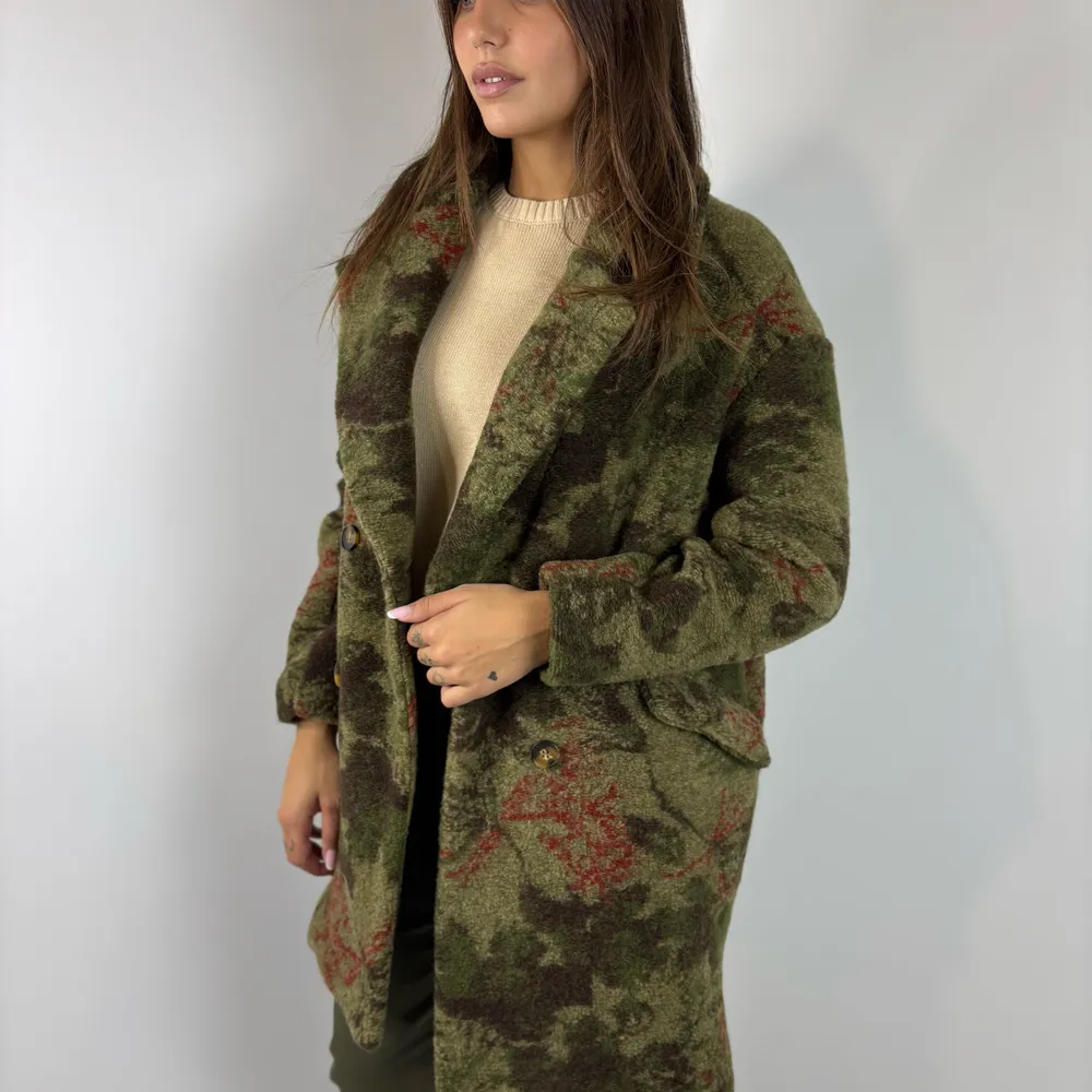 Cappotto fiore jacquard in lana vergine. Doppiopetto, foderato, chiusura bottoni e tasche con pattina.