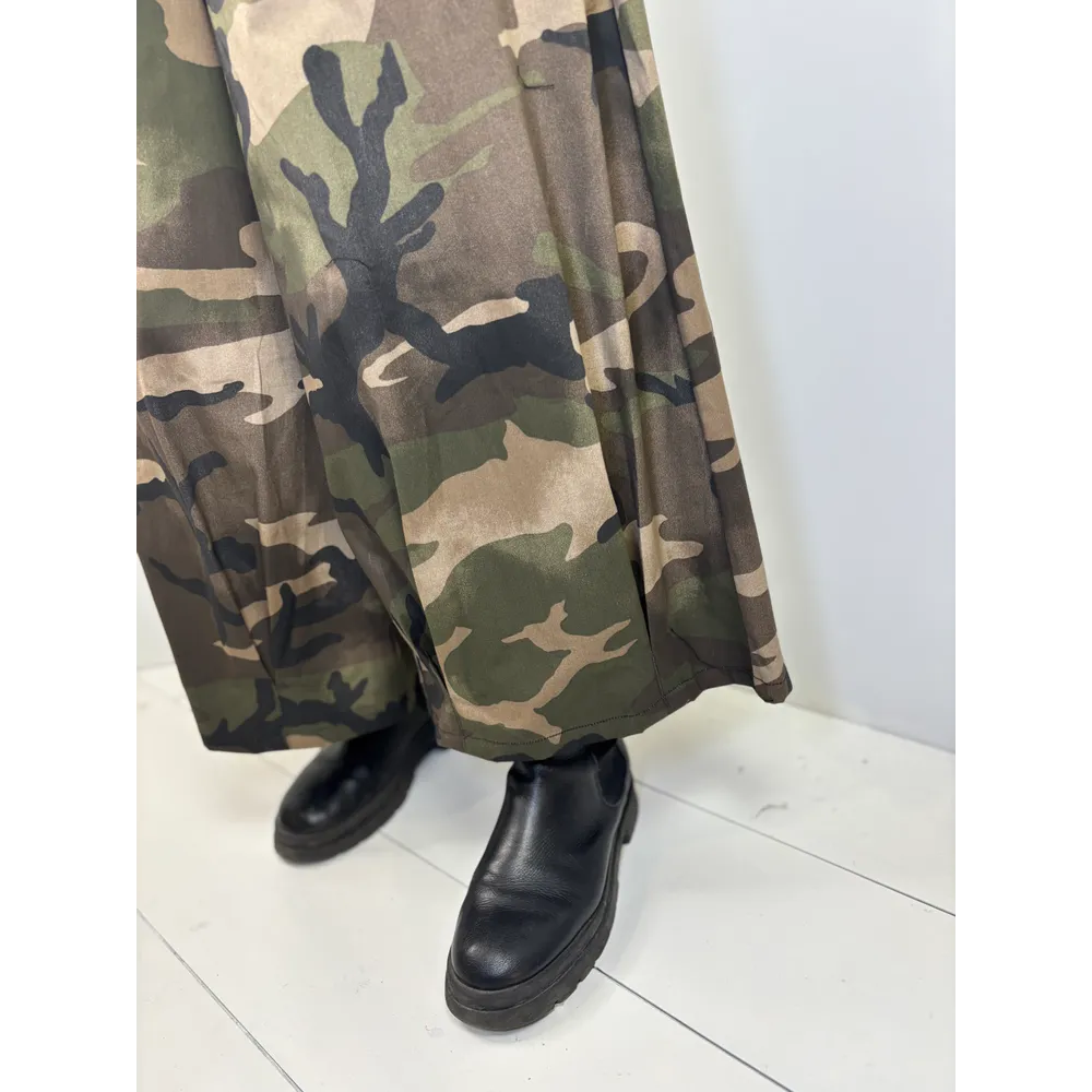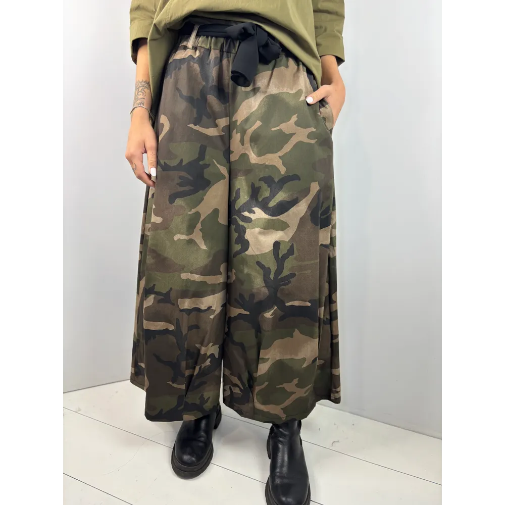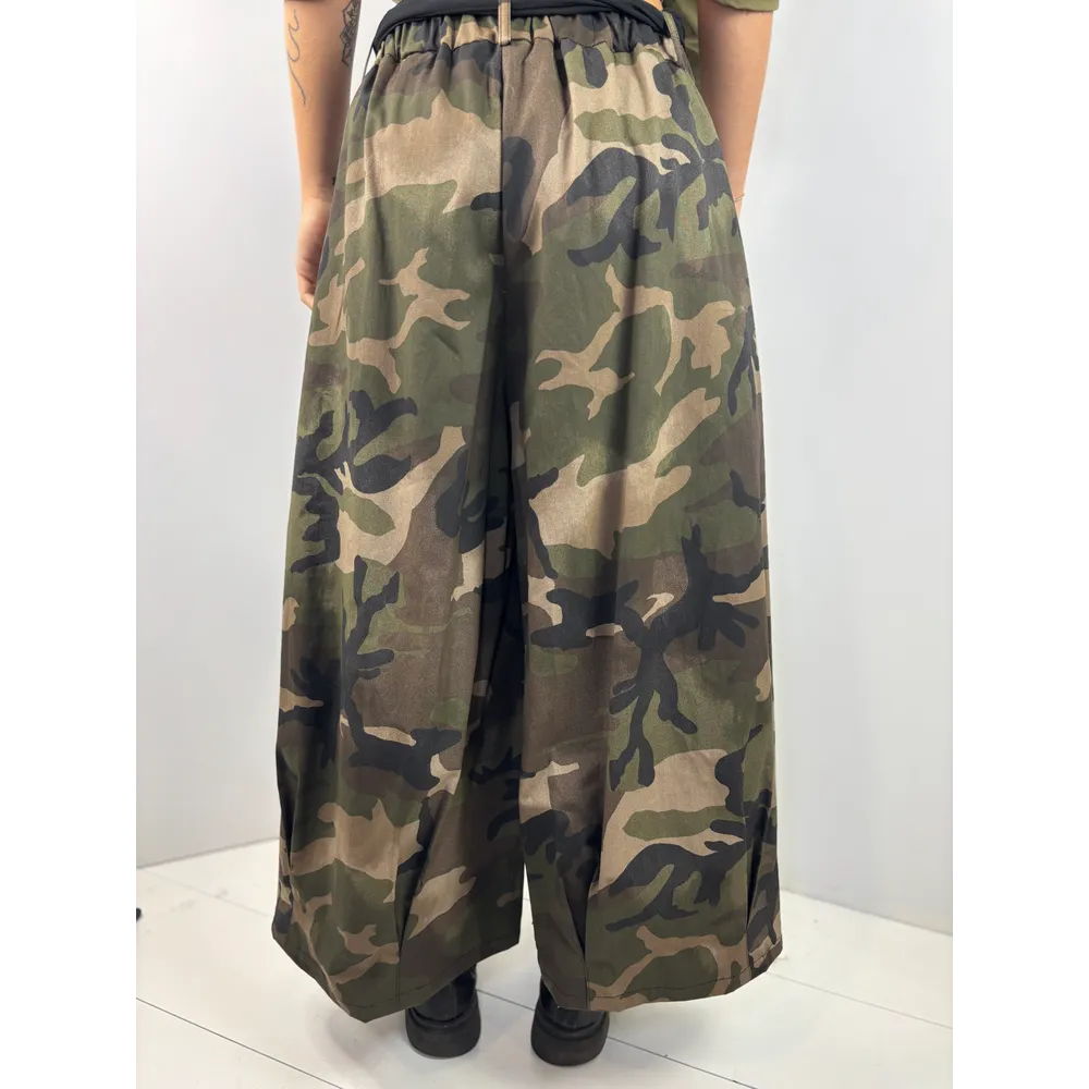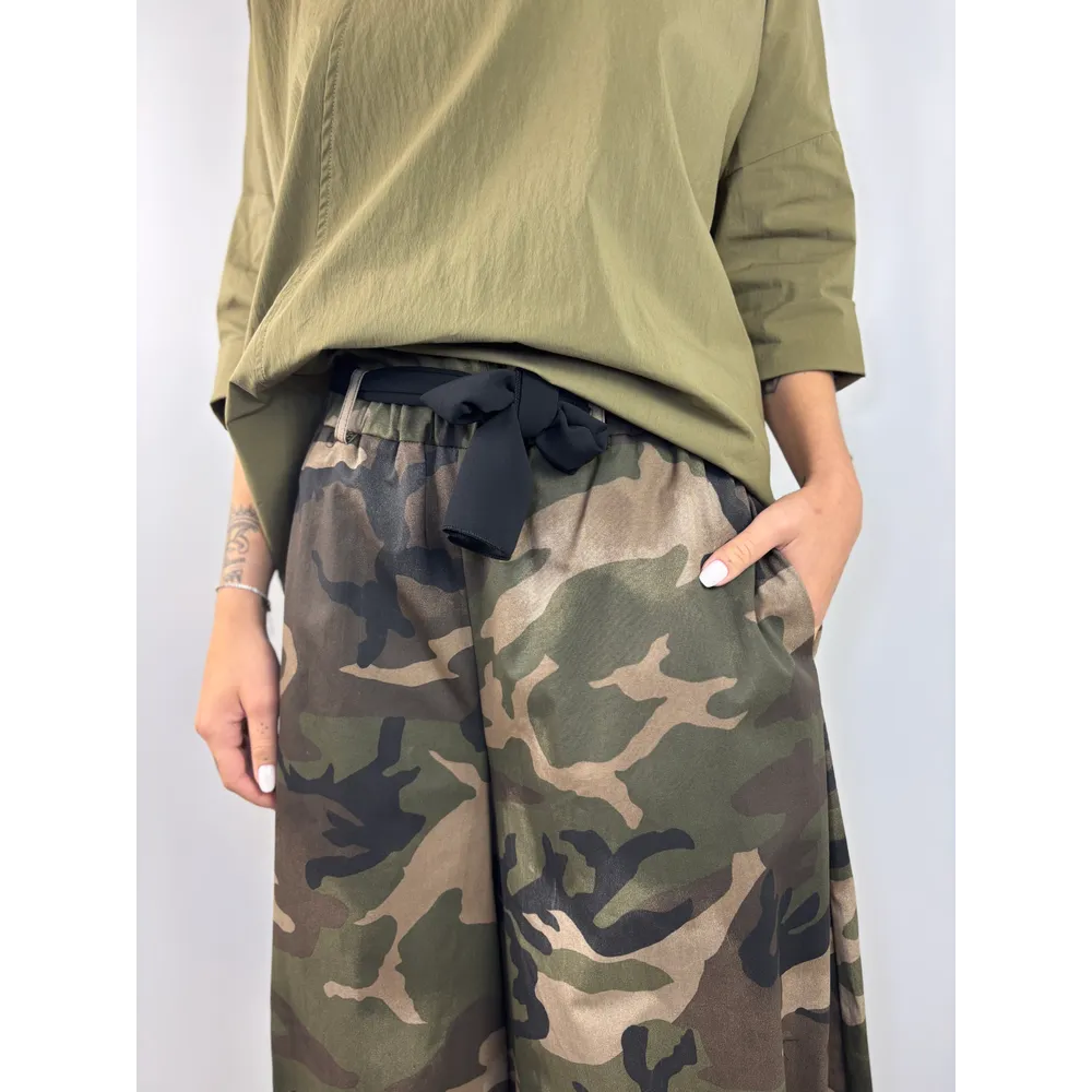 Pantalone largo con elastico in vita e cintura nera in tessuto.