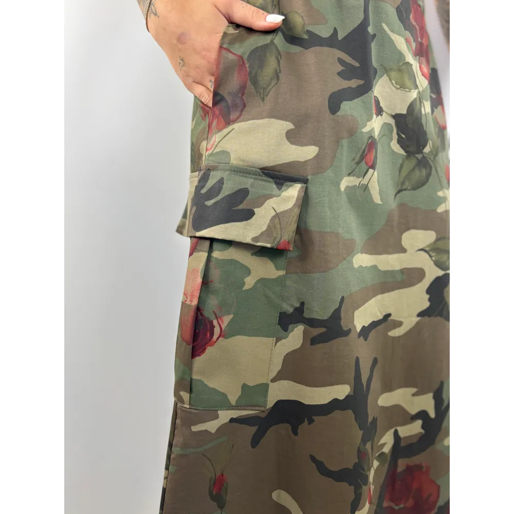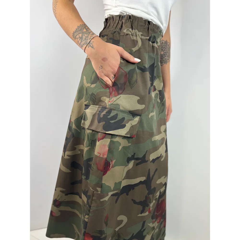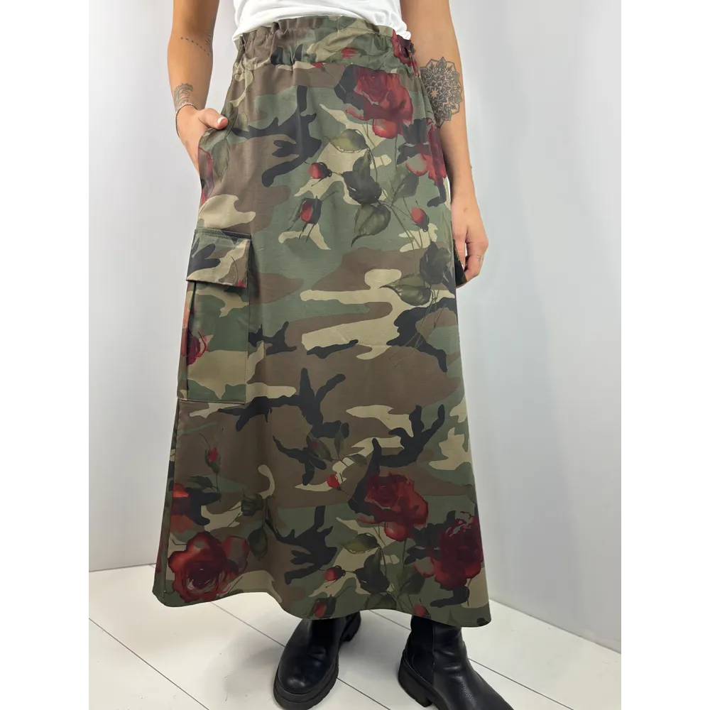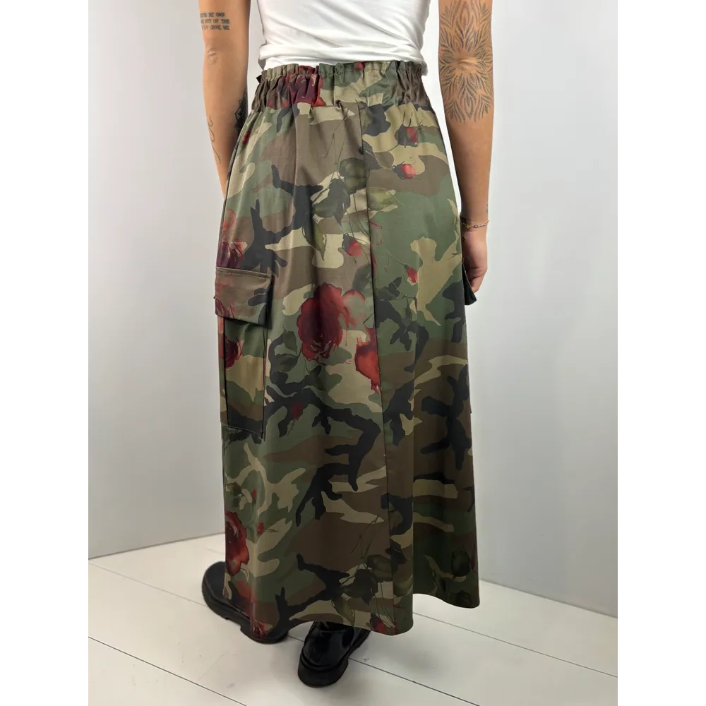 Gonna lunga camouflage con rose rosse. Tasconi laterali