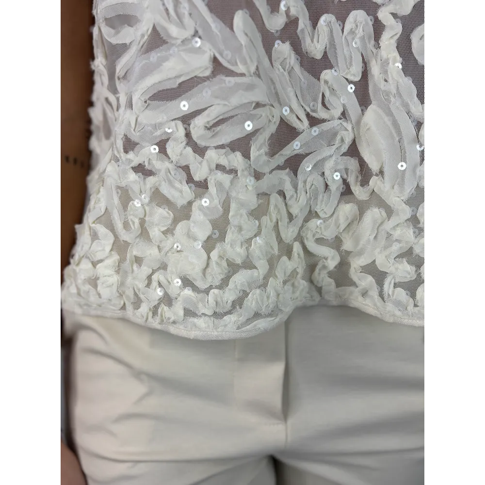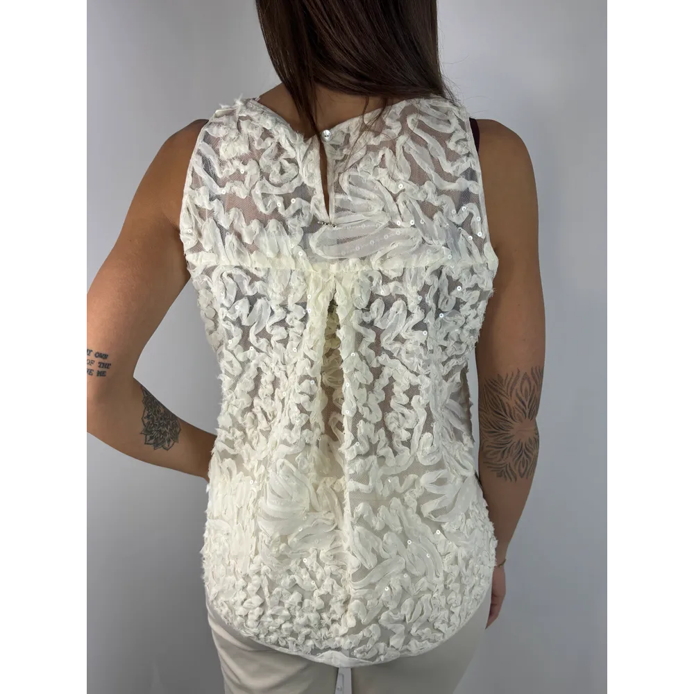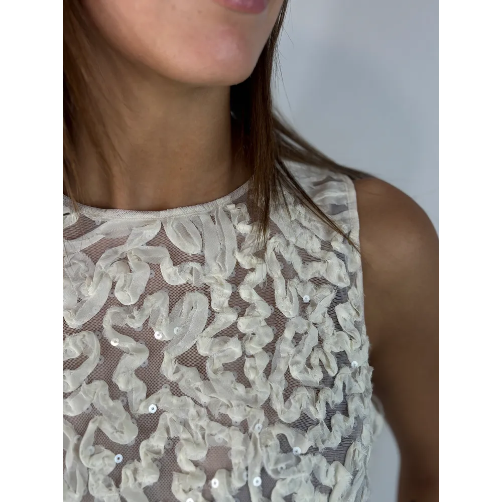 Top con micro paillettes. Chiusura bottoncino dietro il collo.