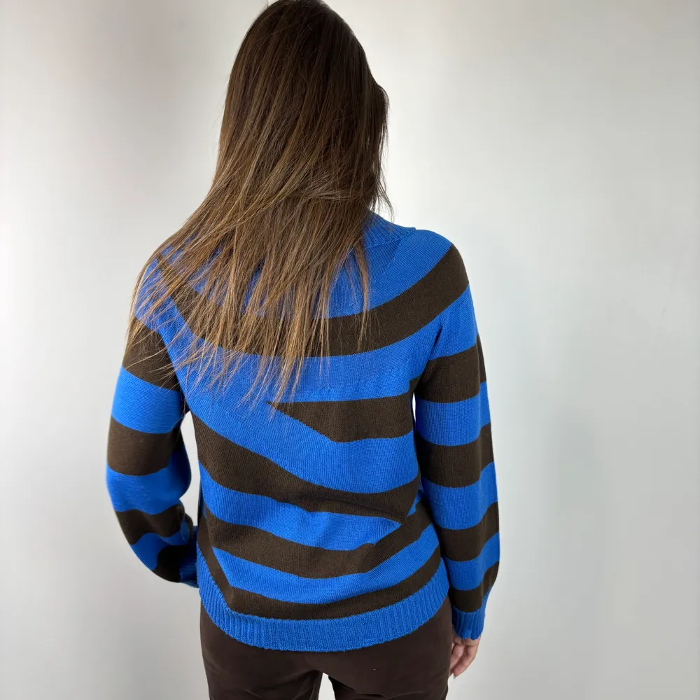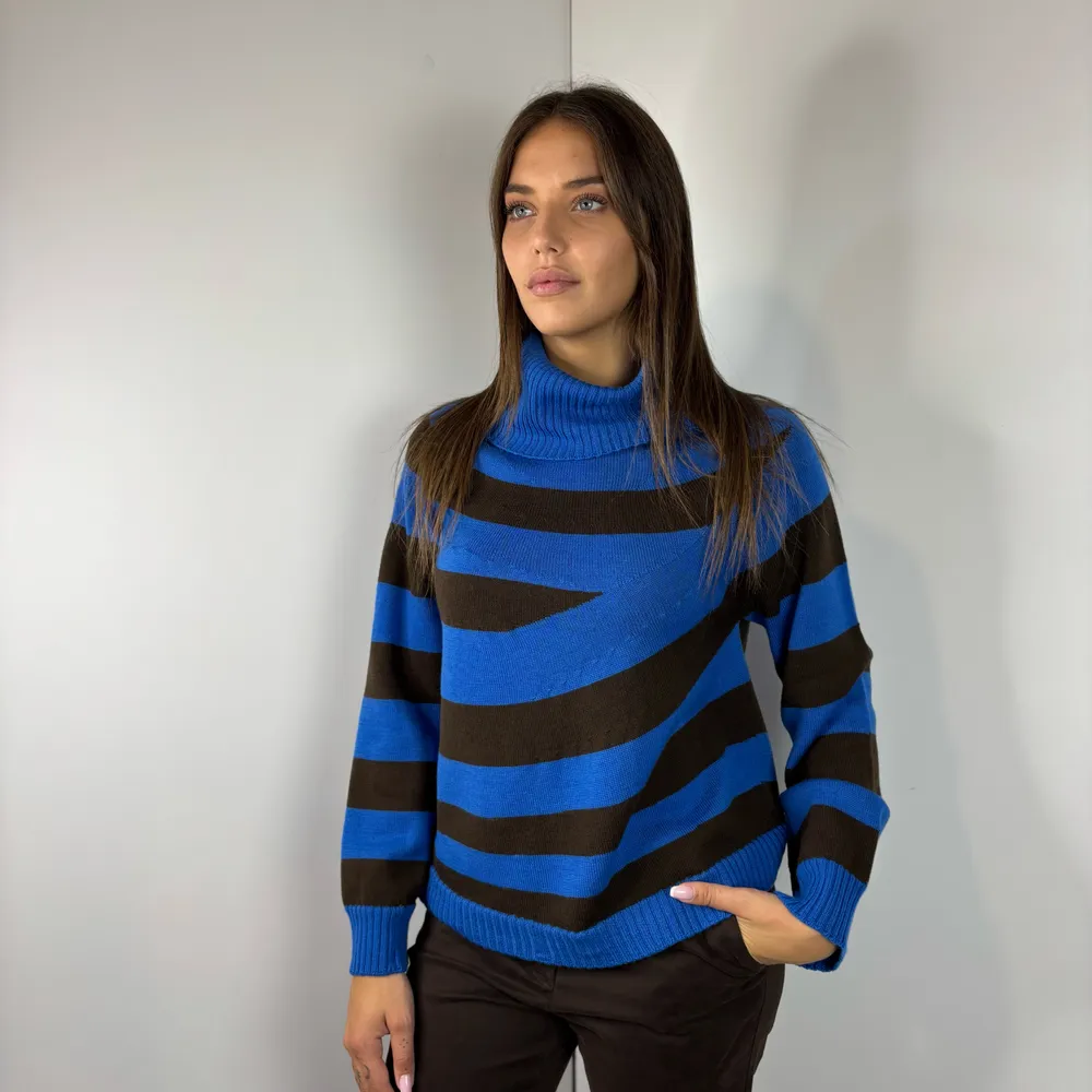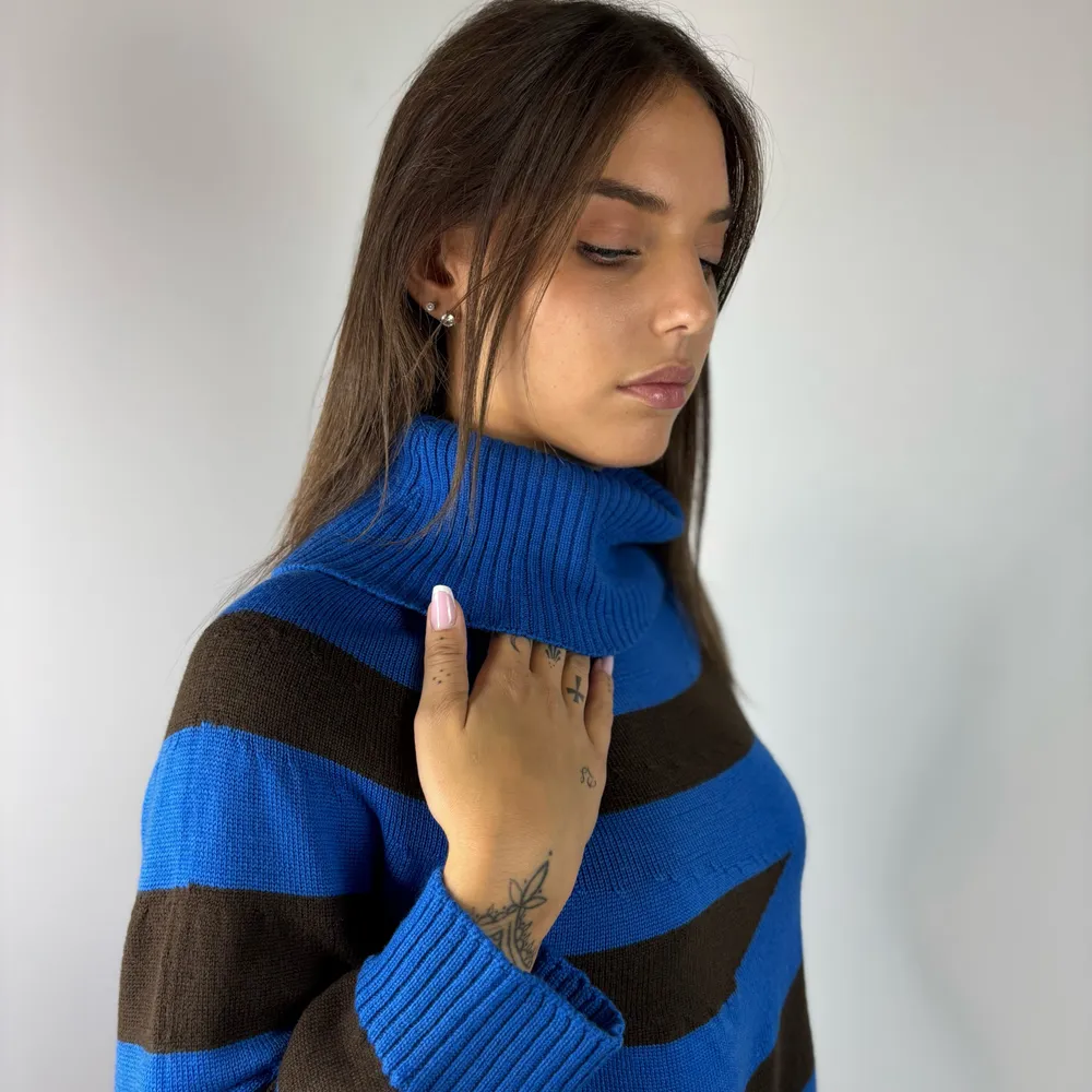 Maglia collo a ciambella bicolore caffè/mare a scatoletta.