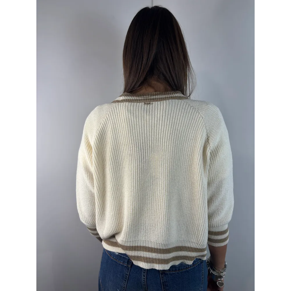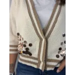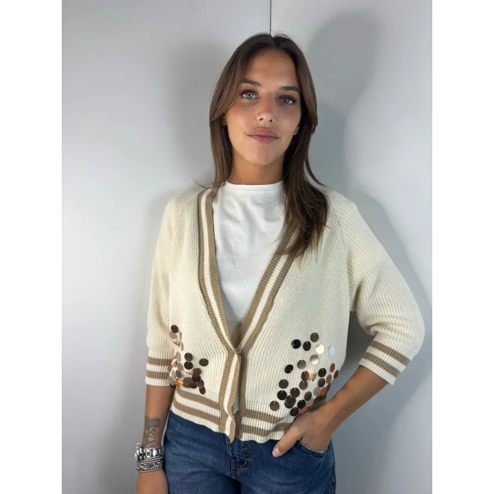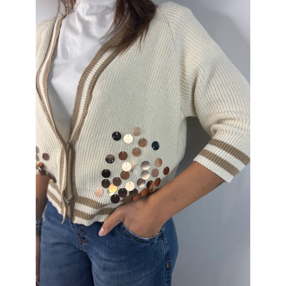 Cardigan con paillettes sulle maniche e bordo in contrasto.