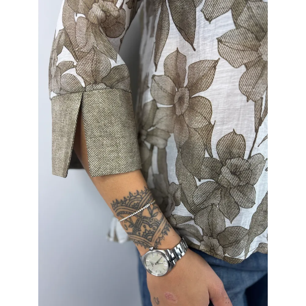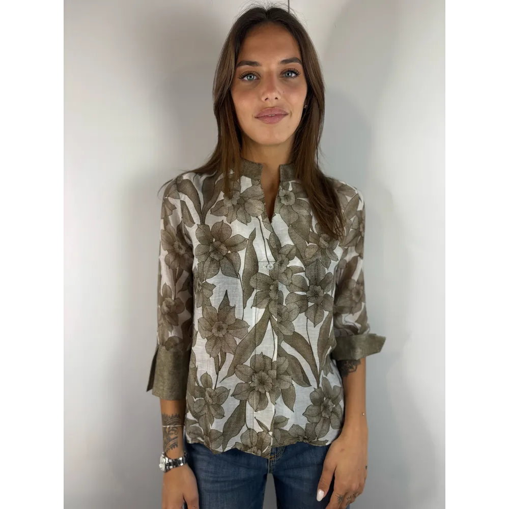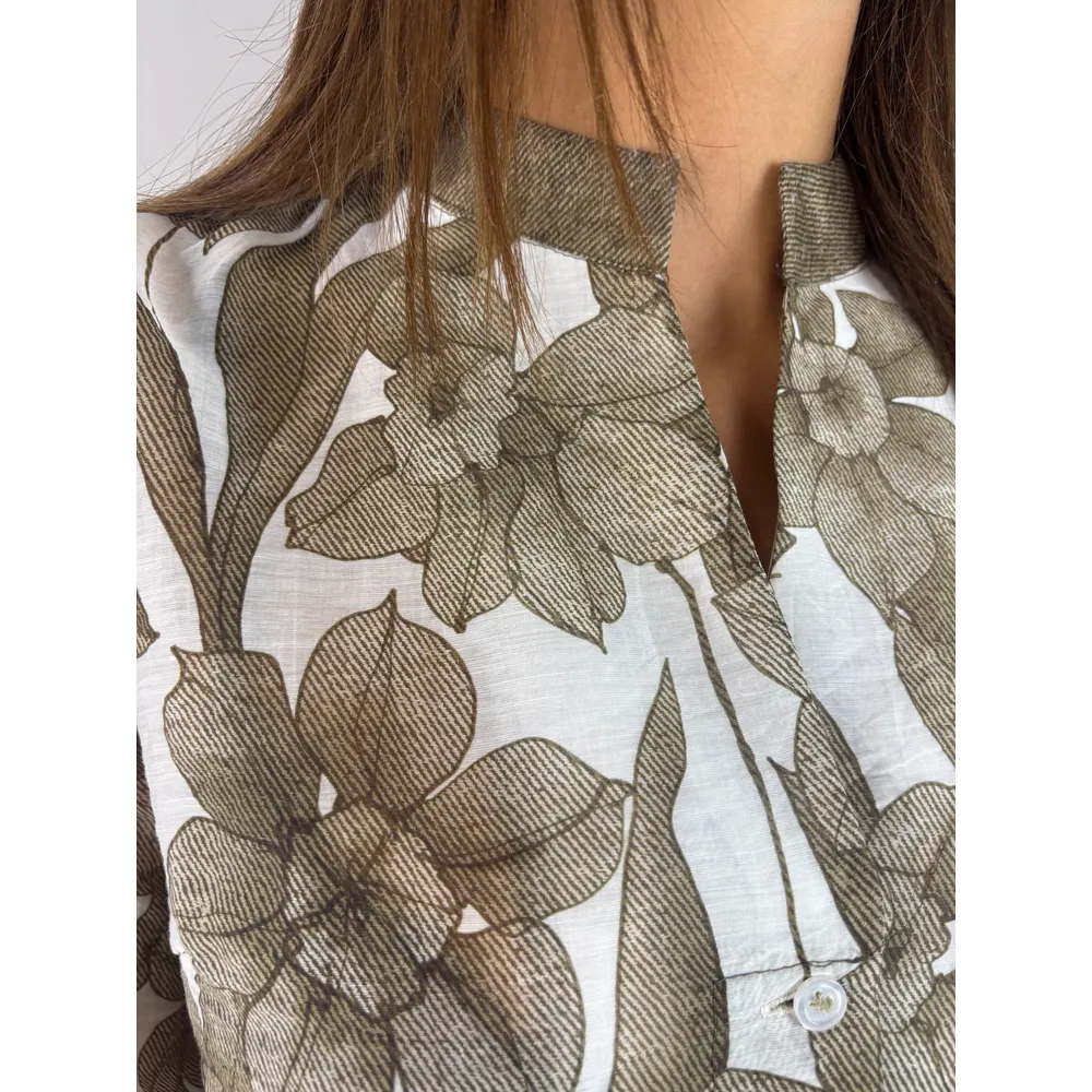 Camicia in fantasia , collo alla coreana, polsino alto aperto.