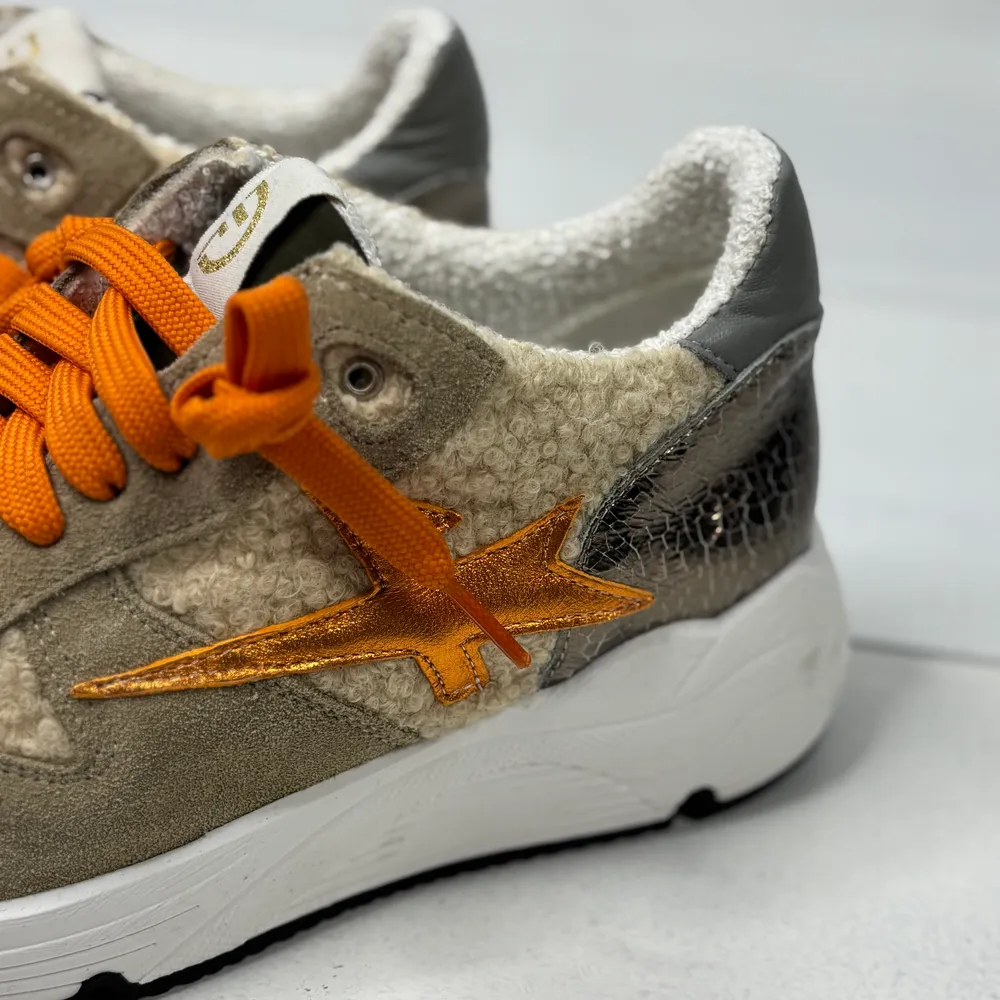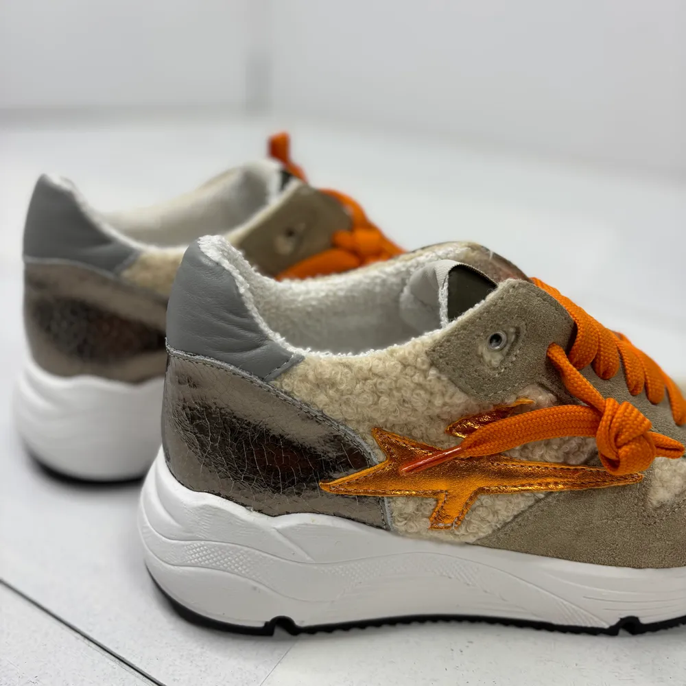 Sneakers con inserti tessuto di pelliccia e ecopelle, dettagli e lacci arancioni.