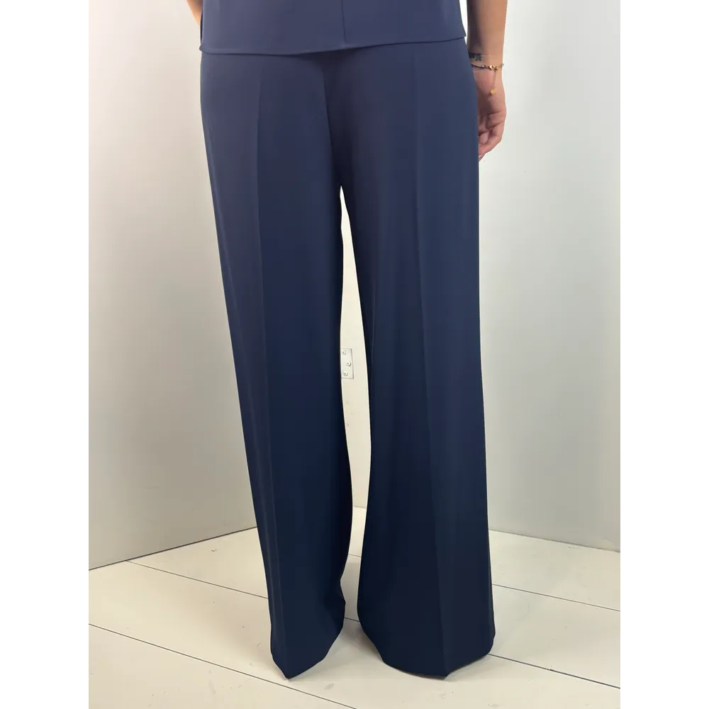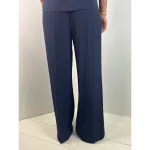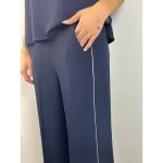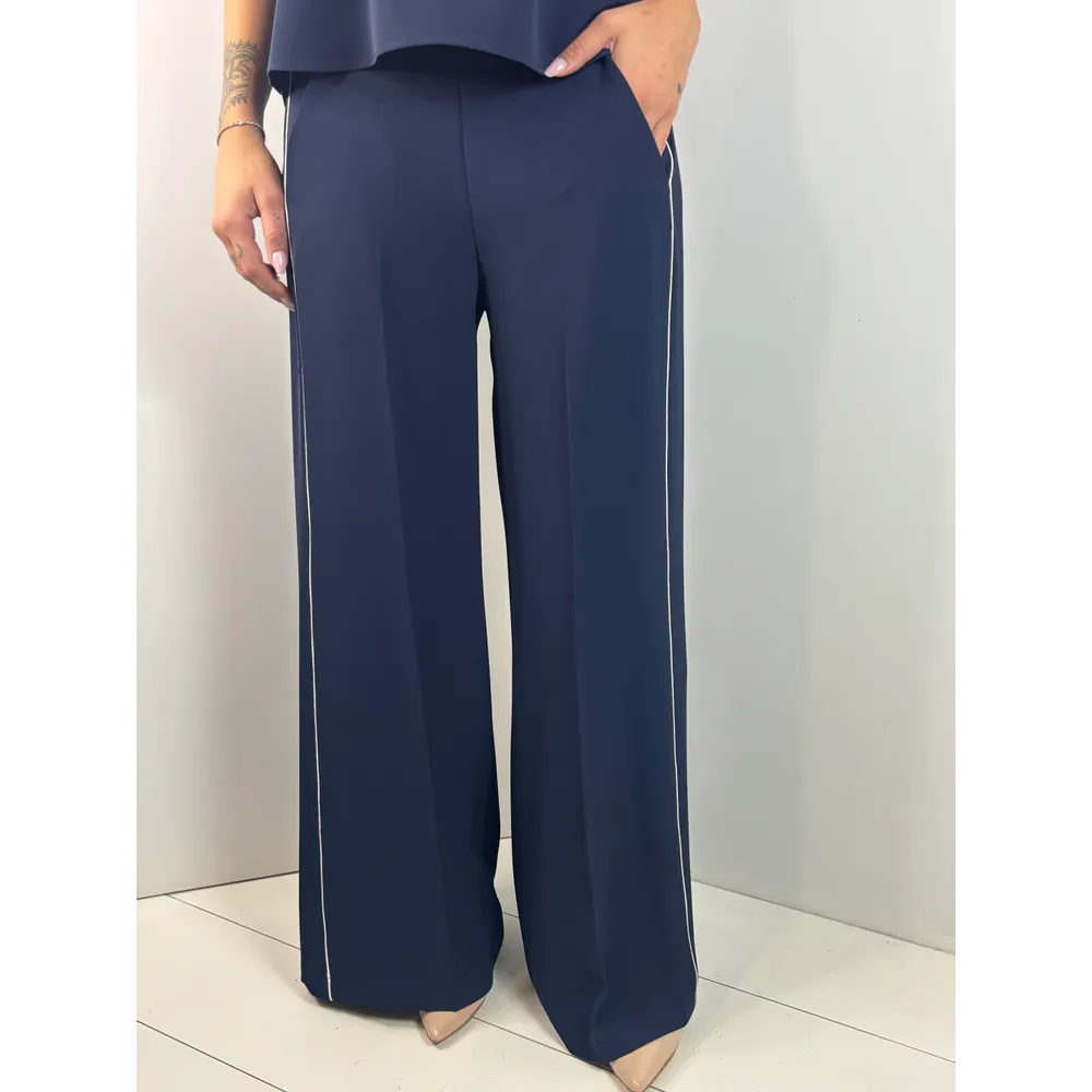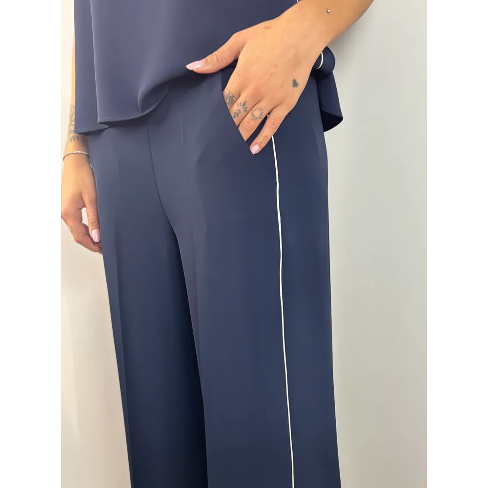 Pantalone palazzo fluido con profilo cordonato bianco.